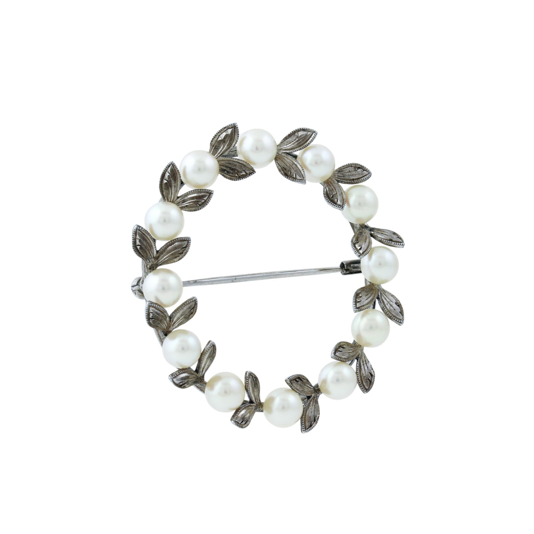 A graceful silver brooch styled as a circular wreath, alternating between lustrous white pearls and intricately detailed silver leaves. Each leaf is bordered with delicate milgrain beading, adding texture and vintage charm to the design.