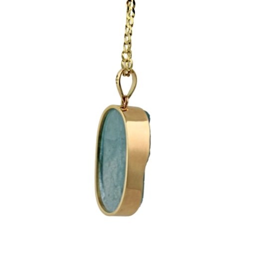 With a sleek, fashionable design, this piece showcases a 14 KT solid gold setting that houses a deep and deep sea Aquamarine left in the raw completely handmade by our shop. A timeless pendant to last the ages.