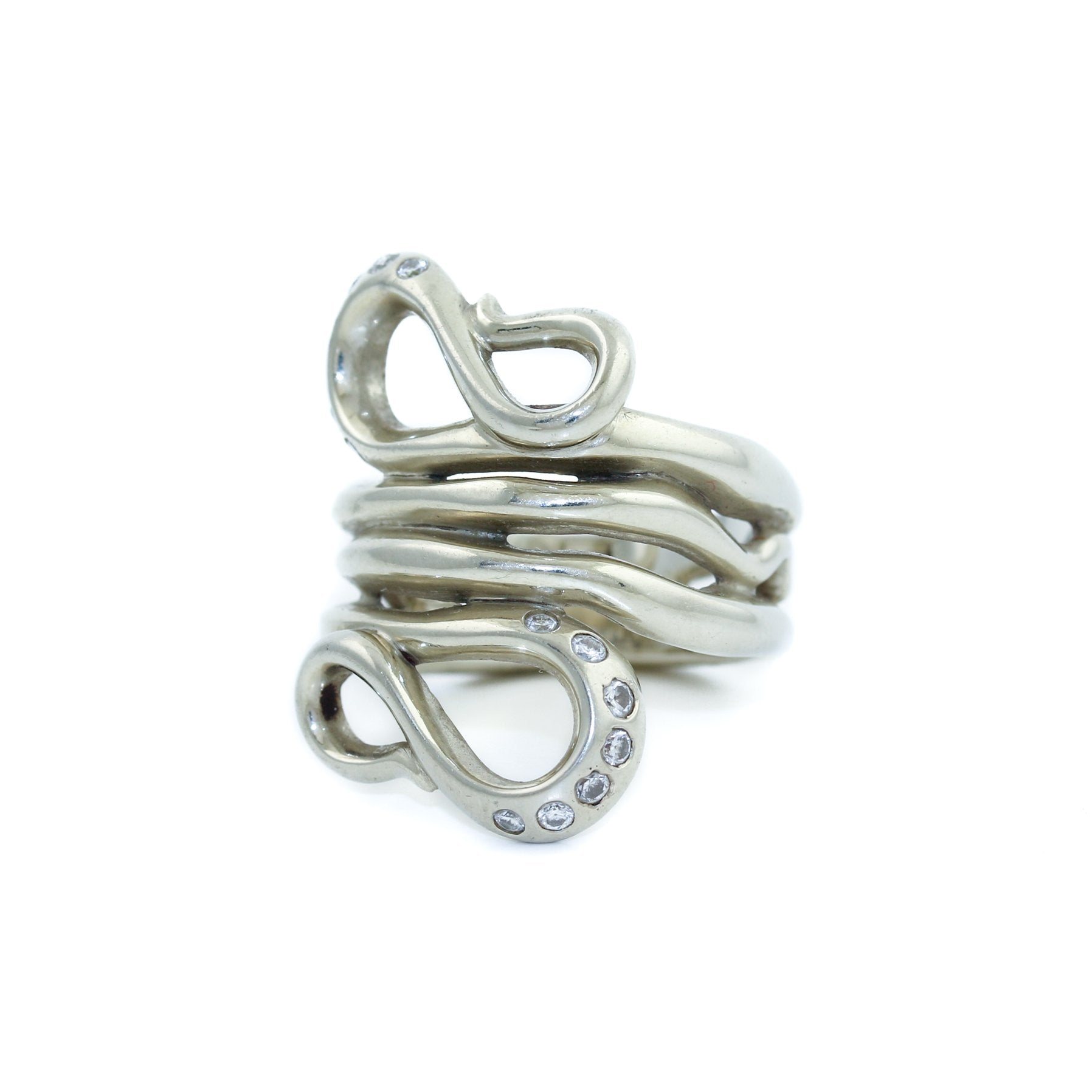 Introducing this captivating white gold 14k ring adorned with sparkling diamonds. This mesmerizing piece exudes elegance and mystery as the sinuous snake design wraps gracefully around your finger. Crafted with meticulous attention to detail, the white gold provides a radiant backdrop for the brilliant diamonds that adorn the snake's body. Symbolizing transformation and wisdom, this snake ring is a powerful statement of style and sophistication. Embrace your inner strength and allure with this exquisite ring.