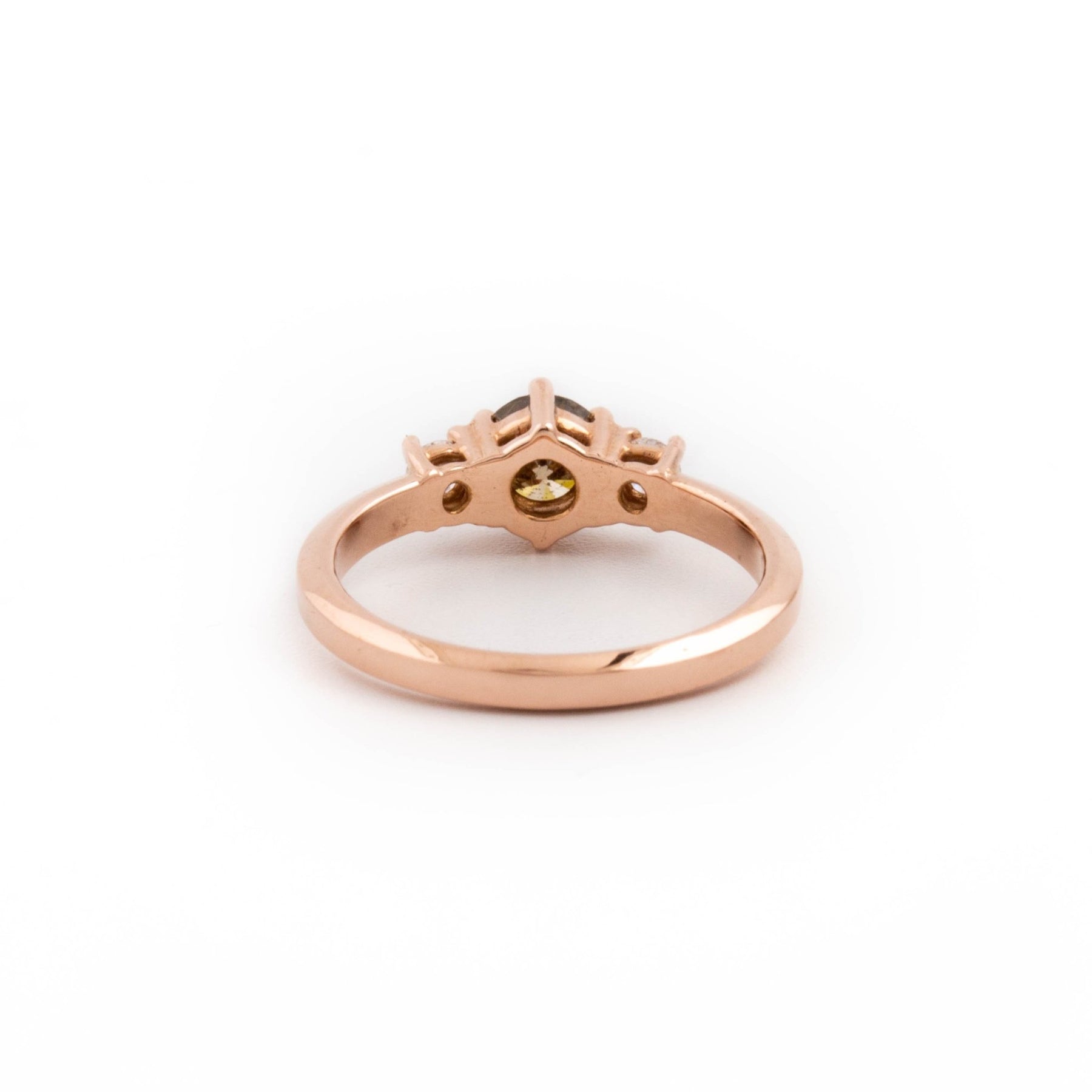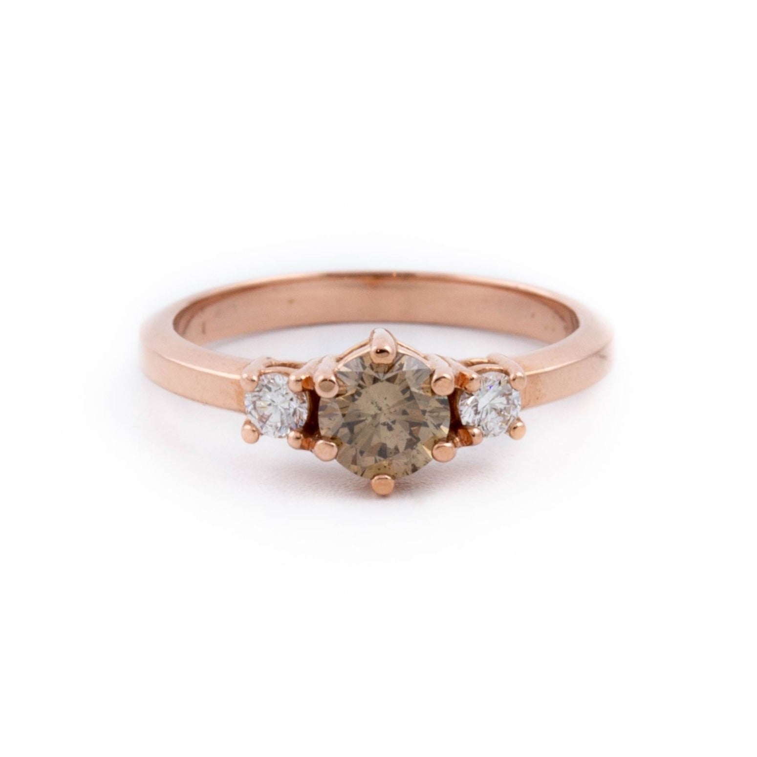From our new Engagement Collection this stunning engagement ring featuring a cognac round-cut diamond, which is a rich ashy-caramel tone, On either side lays two round cut sparkling white diamonds. The band which houses the face is simple, made of 14 kt rose gold, complementing the details of the center stone and diamond accents nicely. Together the elements come together beautifully, to make an engagement ring that is sure to impress and last for a lifetime.
