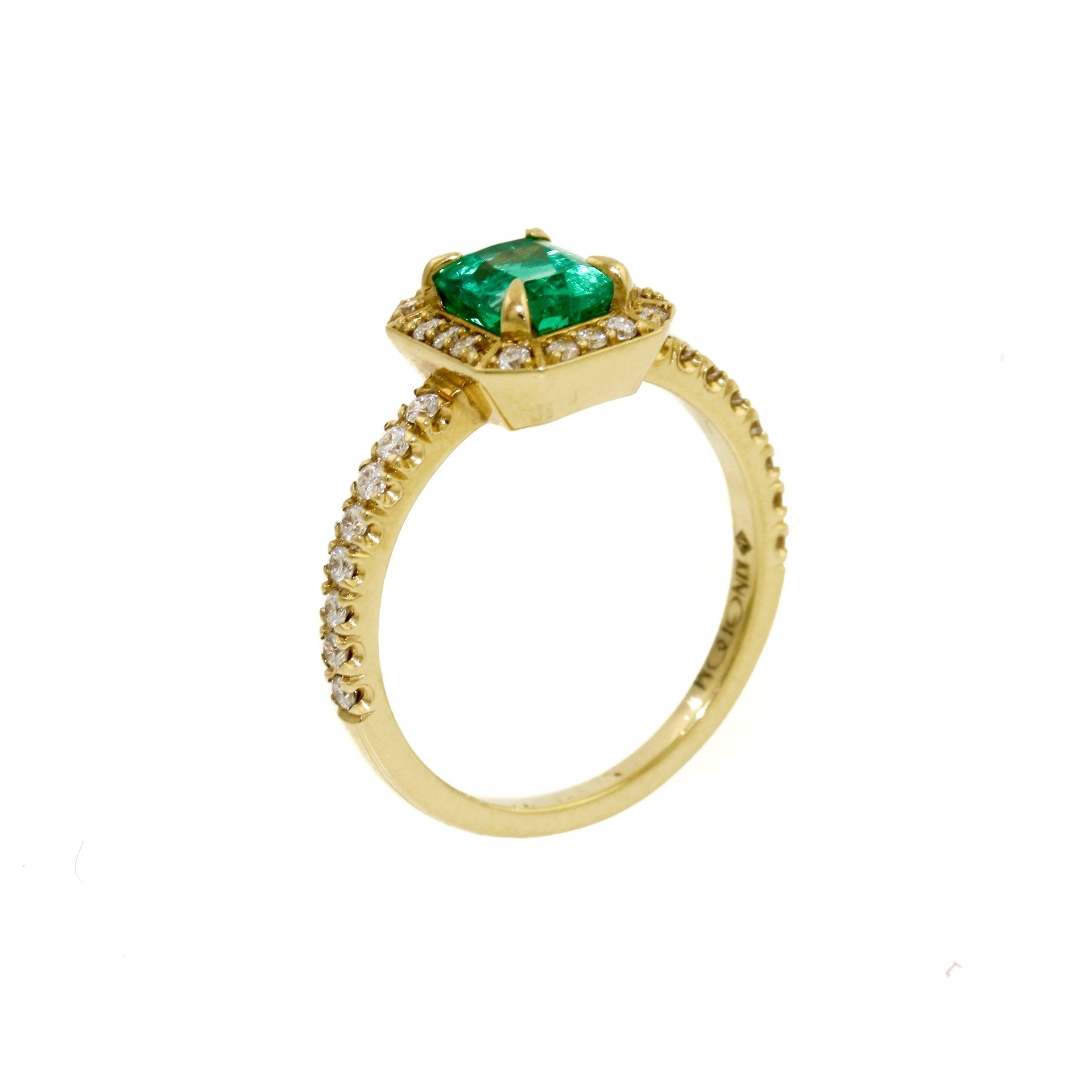 Made in Vancouver By Kingdom Jewelry Using 1.1 Carat Columian Emerald from Muzo, White Diamond Pave and 18 Karat Yellow Gold.
