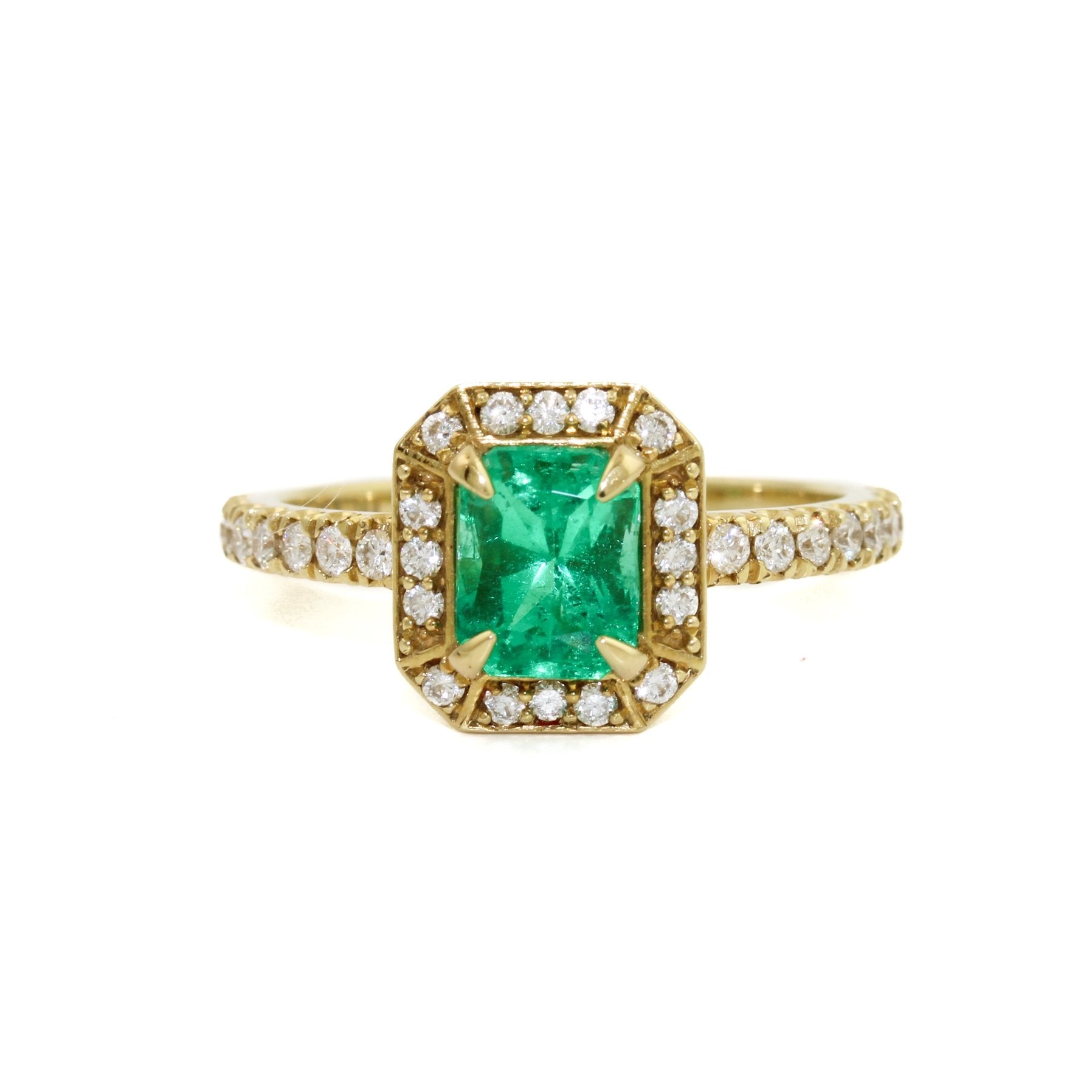 An incredible contemporary ring that will be one to covet. Claw set tight with a halo of micro-pave diamonds, this Columbian emerald from Muzo will take your breath away. Rich 18kt gold pairs elegantly creating a keepsake to pass down for years to come.