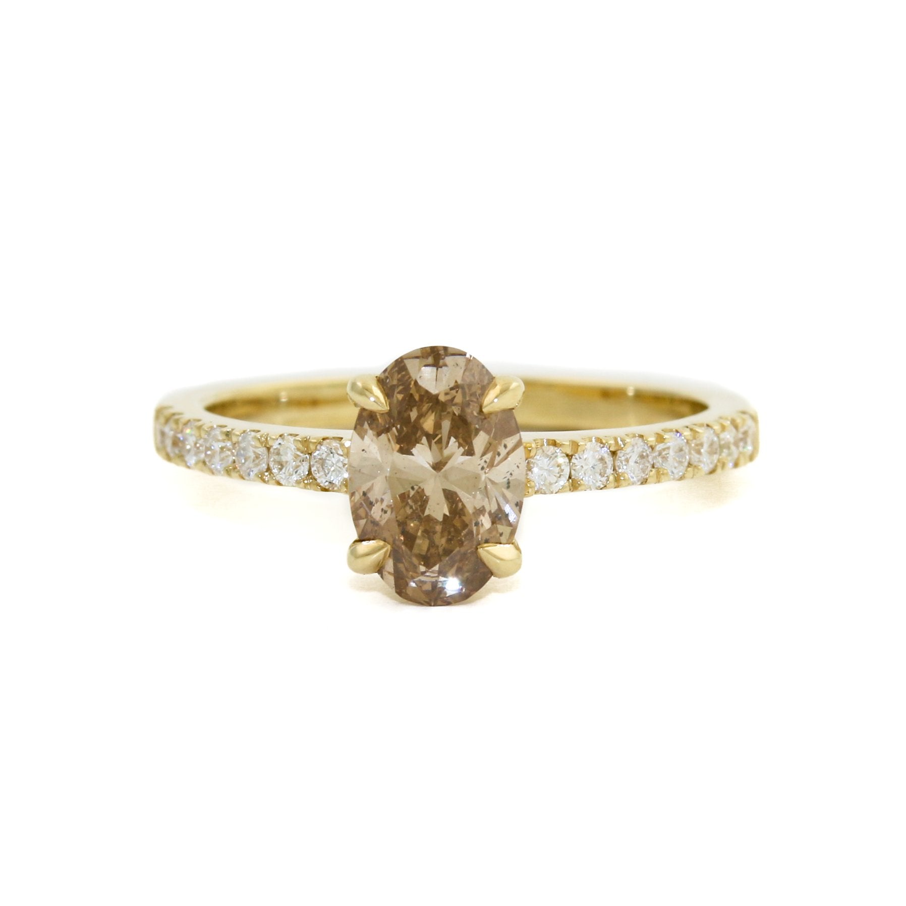 Made in Vancouver By Kingdom Jewelry using 1.03 ct Oval-cut Champagne Diamond, .21ct pave diamonds and 14 Karat Yellow Gold.