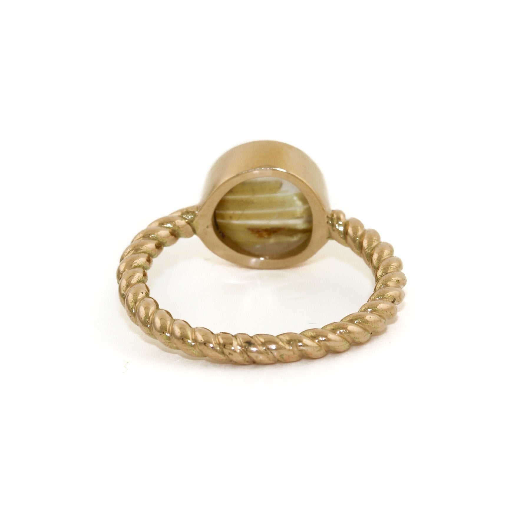 Whether you're looking to make a statement or simply add a touch of sophistication to your outfit, a rutilated quartz and gold ring with a twisted band is a great choice. It is a versatile piece that can be worn for any occasion, whether it be a formal event or a casual day out.
