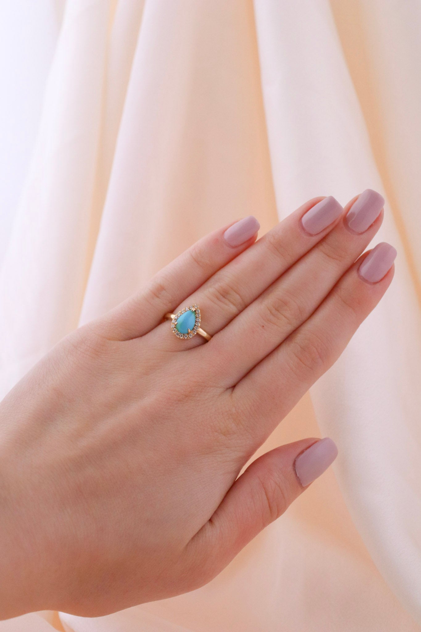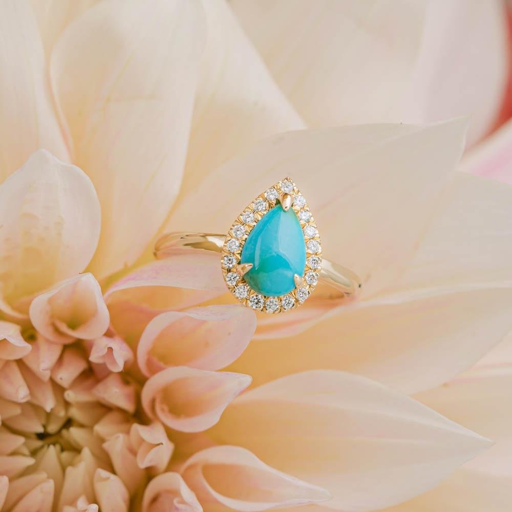 Hand finished and designed in Vancouver as part of our engagement ring series. This stunning 14 kt gold, teardrop shape Sonoran Gold turquoise and white diamond hallow ring. The contrast between the yellow gold, rich blue green turquoise and white diamond creates a unique piece that is sure to impress. For the alternative bride that loves something unique, this beauty is for you.