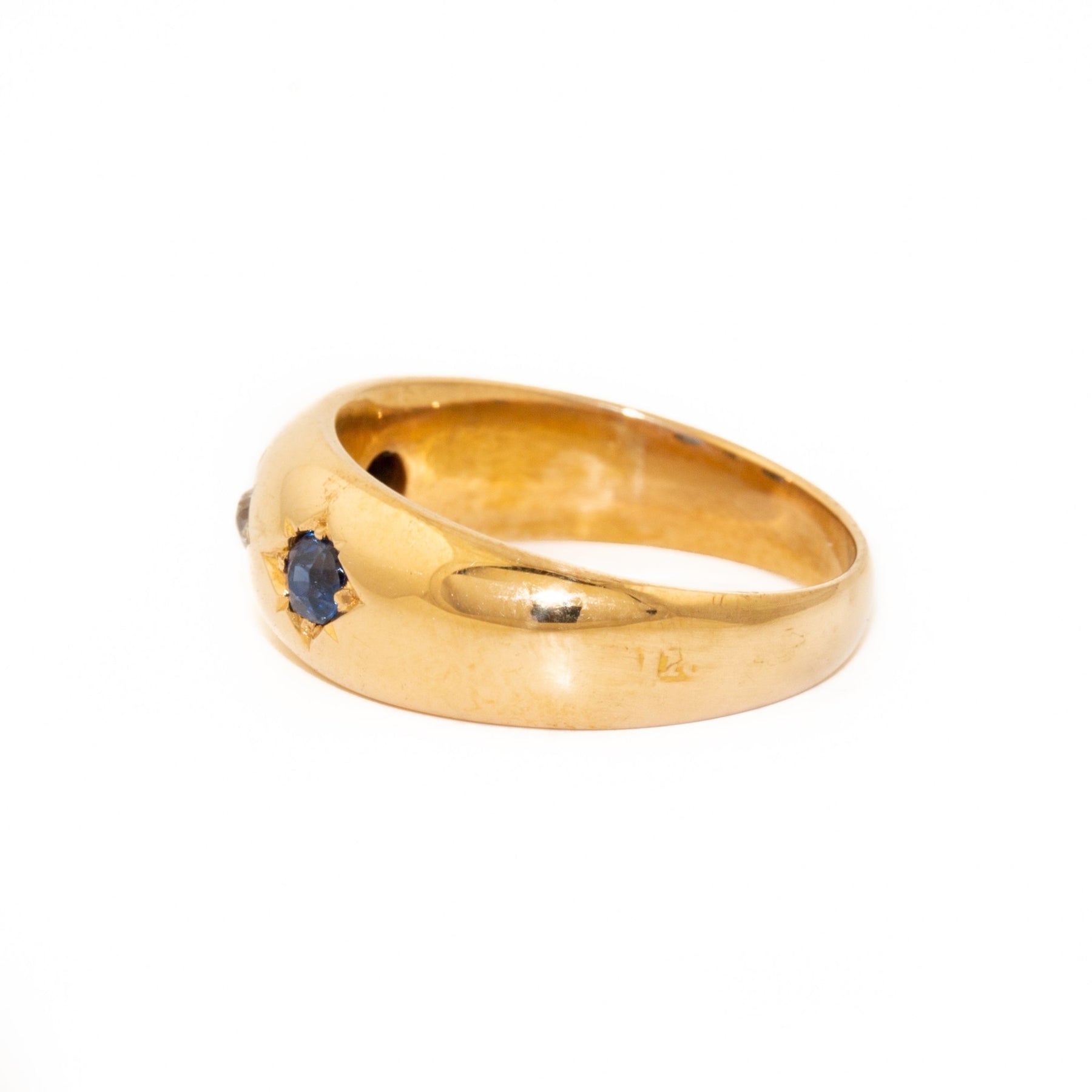 A sweet antique gold ring. A beautiful smooth band is set with one rose cut diamond and two faceted sapphires. Created using 18 KT gold, this is a lovely design that makes it a timeless piece that matches well with an assortment of other styles of jewelry. A great alternative wedding bands