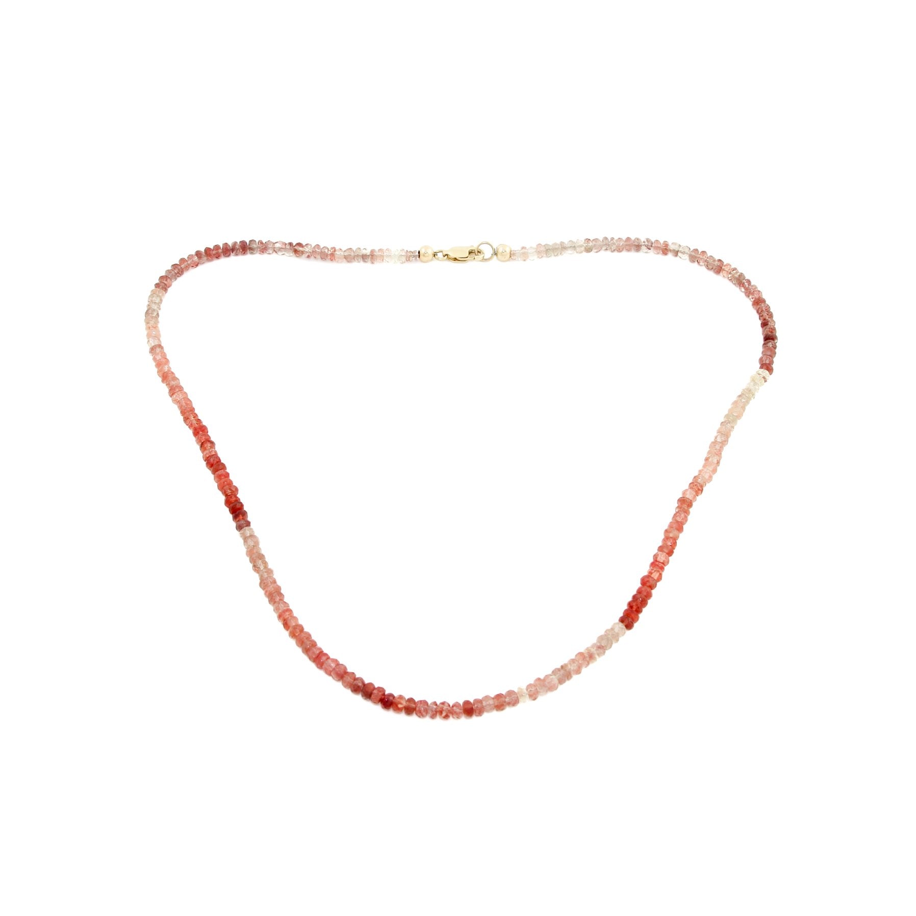 Andalucía" features a captivating gradient of zircon beads, ranging from warm reds to soft pinks. Reminiscent of the fiery sunsets and blooming flowers of southern Spain, the hues blend harmoniously, evoking feelings of passion and romance. The addition of a 10K solid gold clasp adds a touch of luxury and sophistication to this already stunning piece.