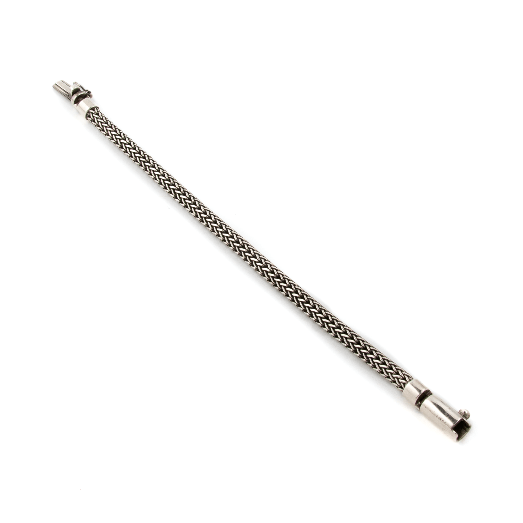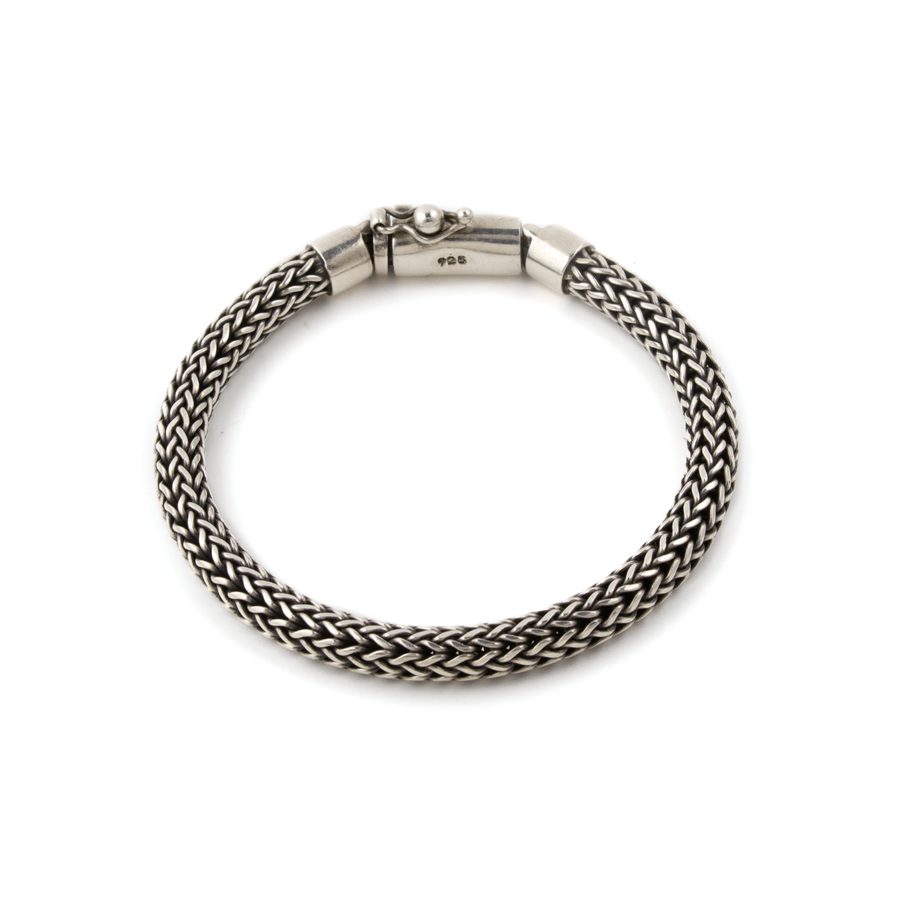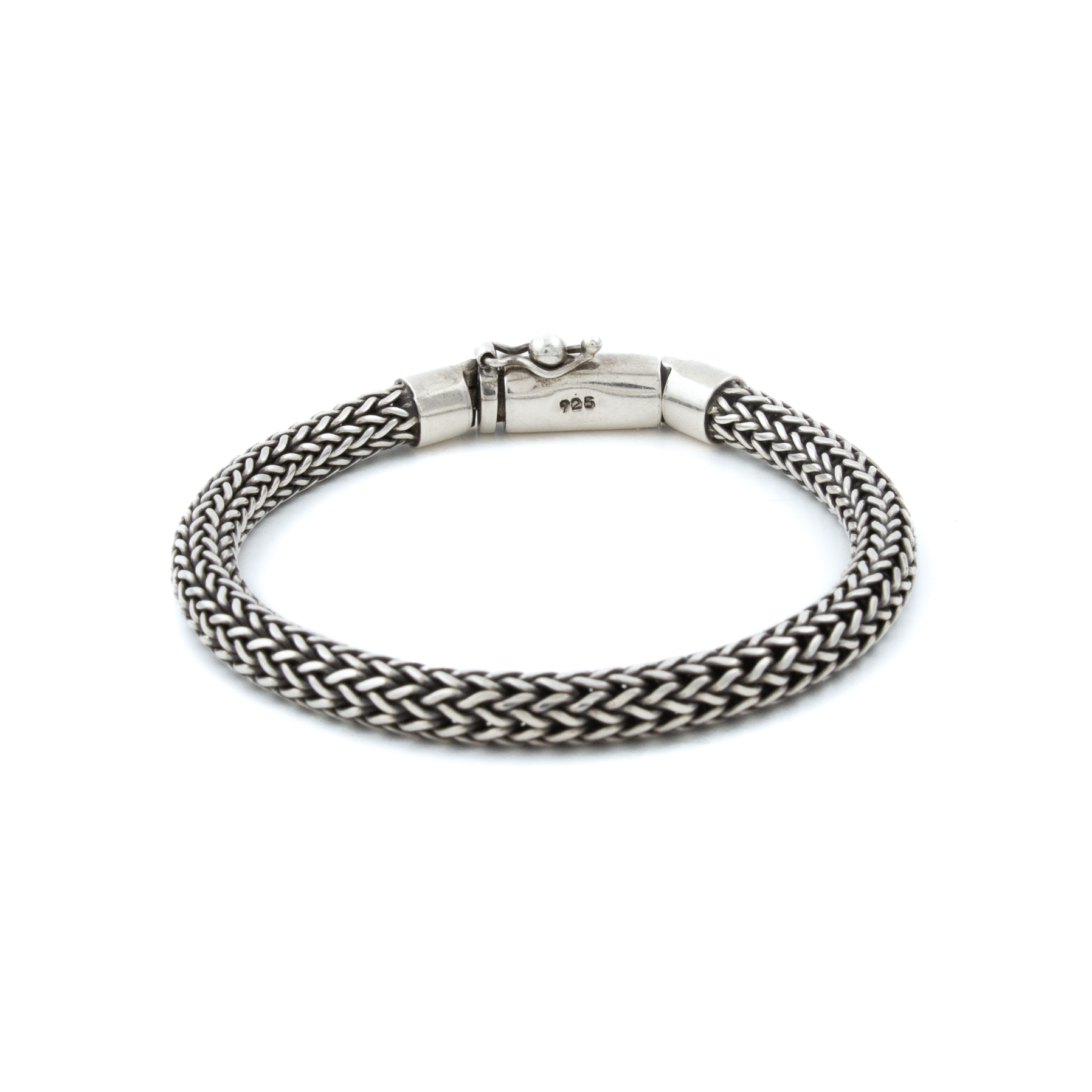 An excellent Balinese snake chain from the Indonesian island of Bali, that's finely woven and completely comprised of sterling silver. With a very secure double locking clasp and rounded design, this bracelet was made to be super comfortable and flawless in detail. A great statement piece to wear everyday or layer up with more silver for a stronger look.