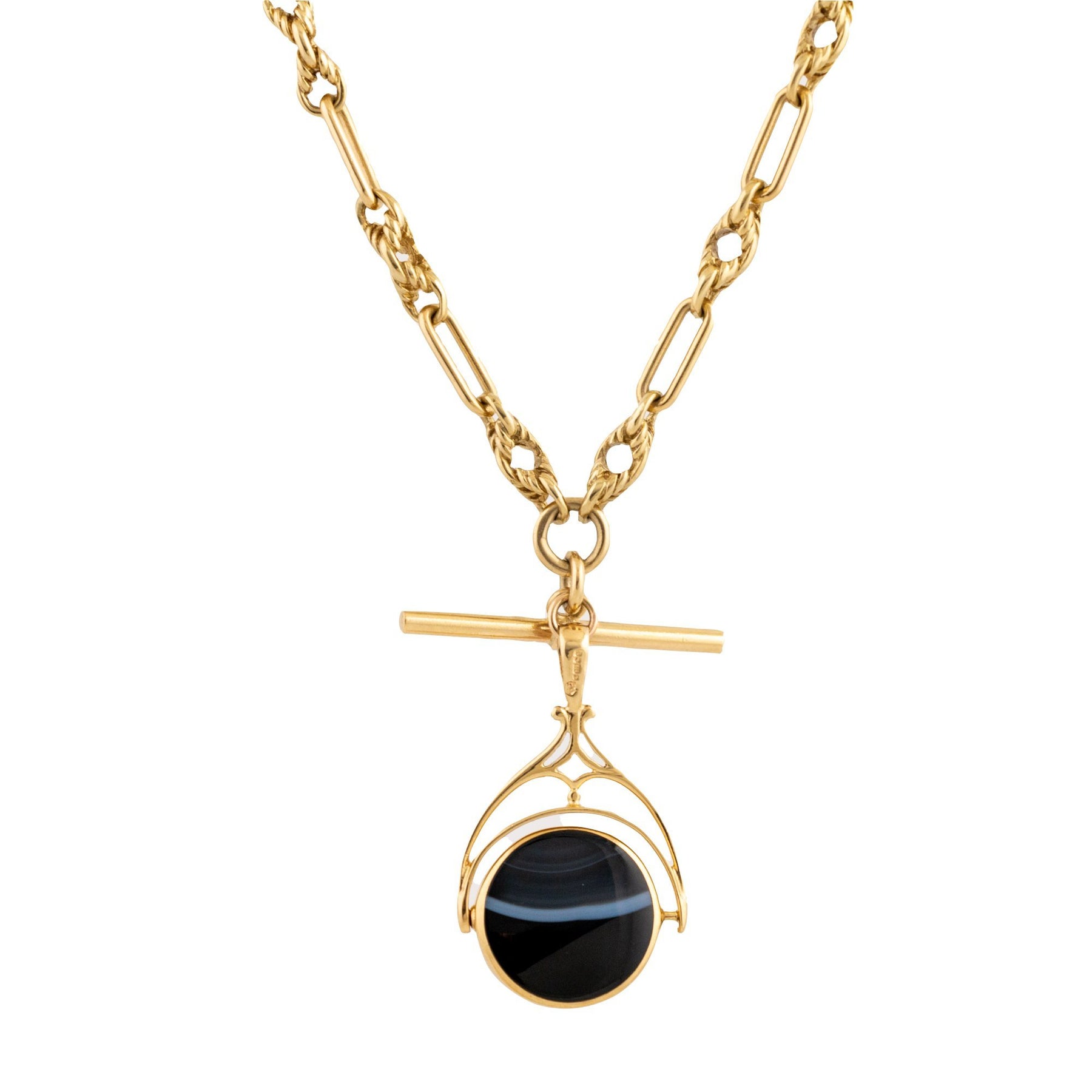 A stunning antique 9 kt gold watch chain showcasing it's age and antiquity. Featuring a beautiful double sided agate fob adding to the uniqueness of this piece. This beauty would be amazing layered up, paired with a pendant or as a stand alone piece.