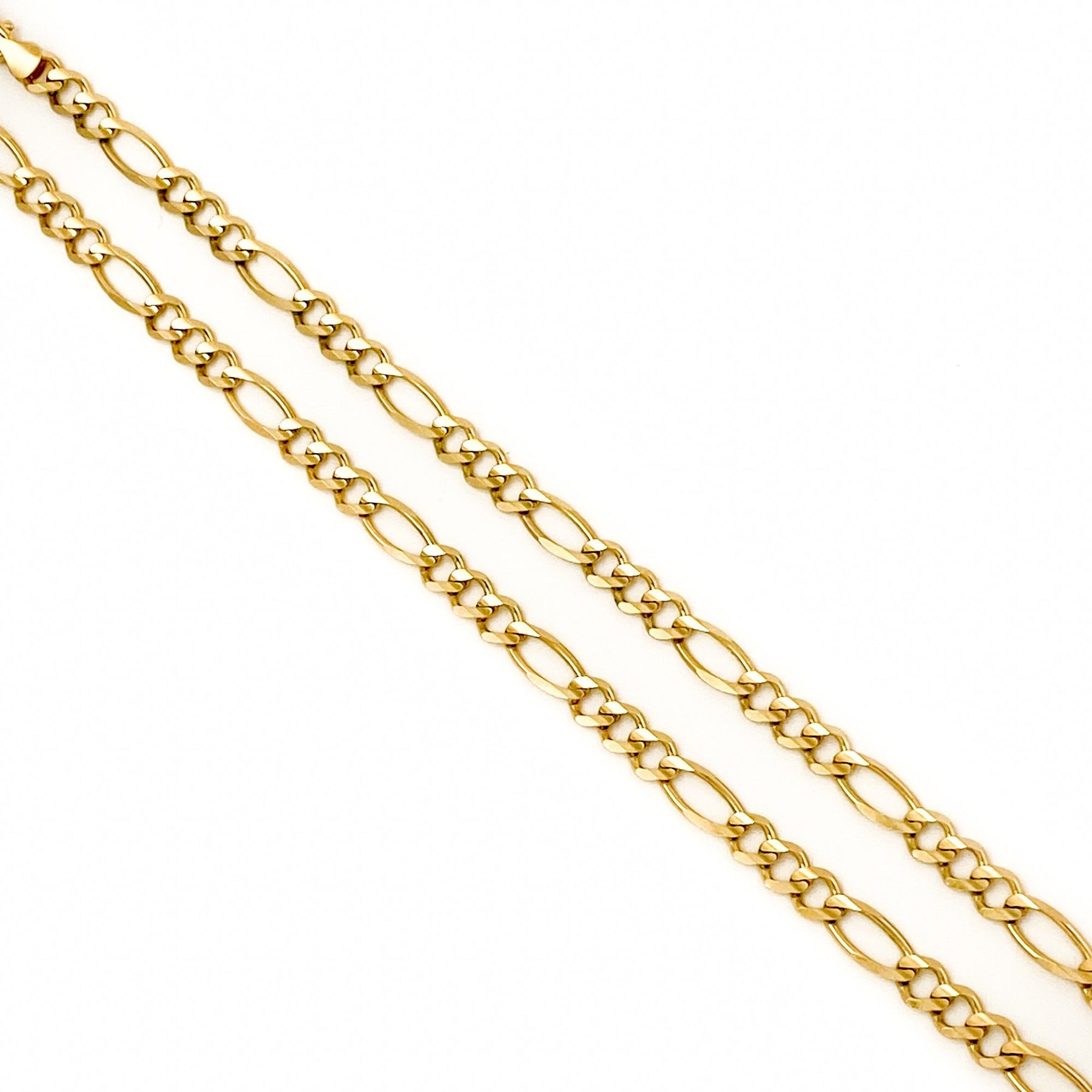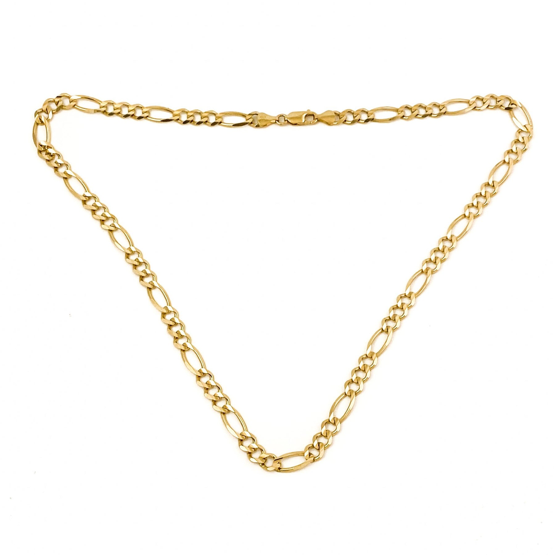 An absolutely, wicked gold chain necklace that is sure to impress. This excellent piece features a fancy Figaro link chain comprised entirely out of 10kt yellow gold. This Figaro style chain link is flat on one side for comfort, and half round on top giving this piece a more geometric modern feel.