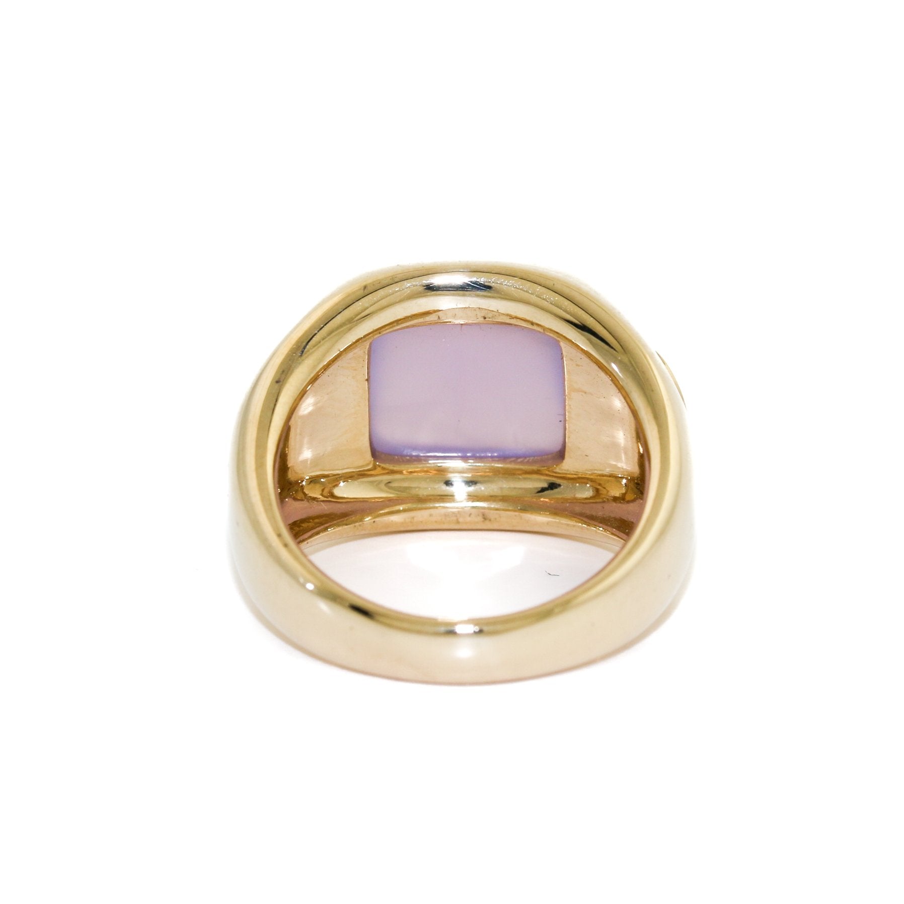 Step into a world of enchantment with this stunning 14kt yellow gold gypsy set ring, adorned with a captivating combination of chalcedony and Sleeping Beauty turquoise. The delicate soft purple hue of the chalcedony is exquisitely complemented by the vivid blue of the Sleeping Beauty turquoise, evocative of a clear summer sky.