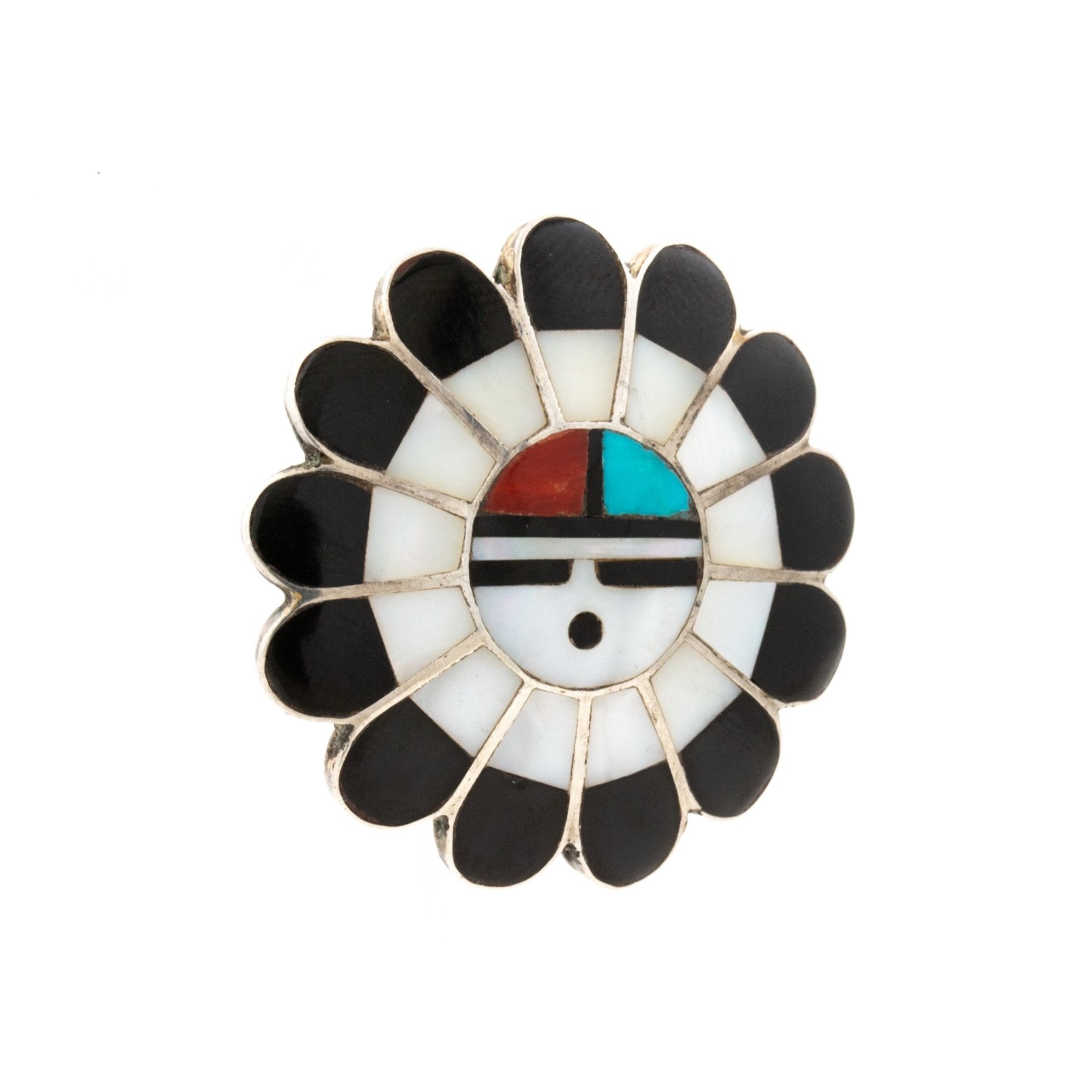 This amazing Zuni Sun Face brooch pin is the perfect statement piece for your collection. This pin features a flower petal motif, with each petal inlaid with jet, while the face is made with turquoise, coral, jet and mother of pearl. A piece of jewelry that would look awesome paired with any of your favourite gems or that would just a great accessory on a hat, bag or piece of clothing.