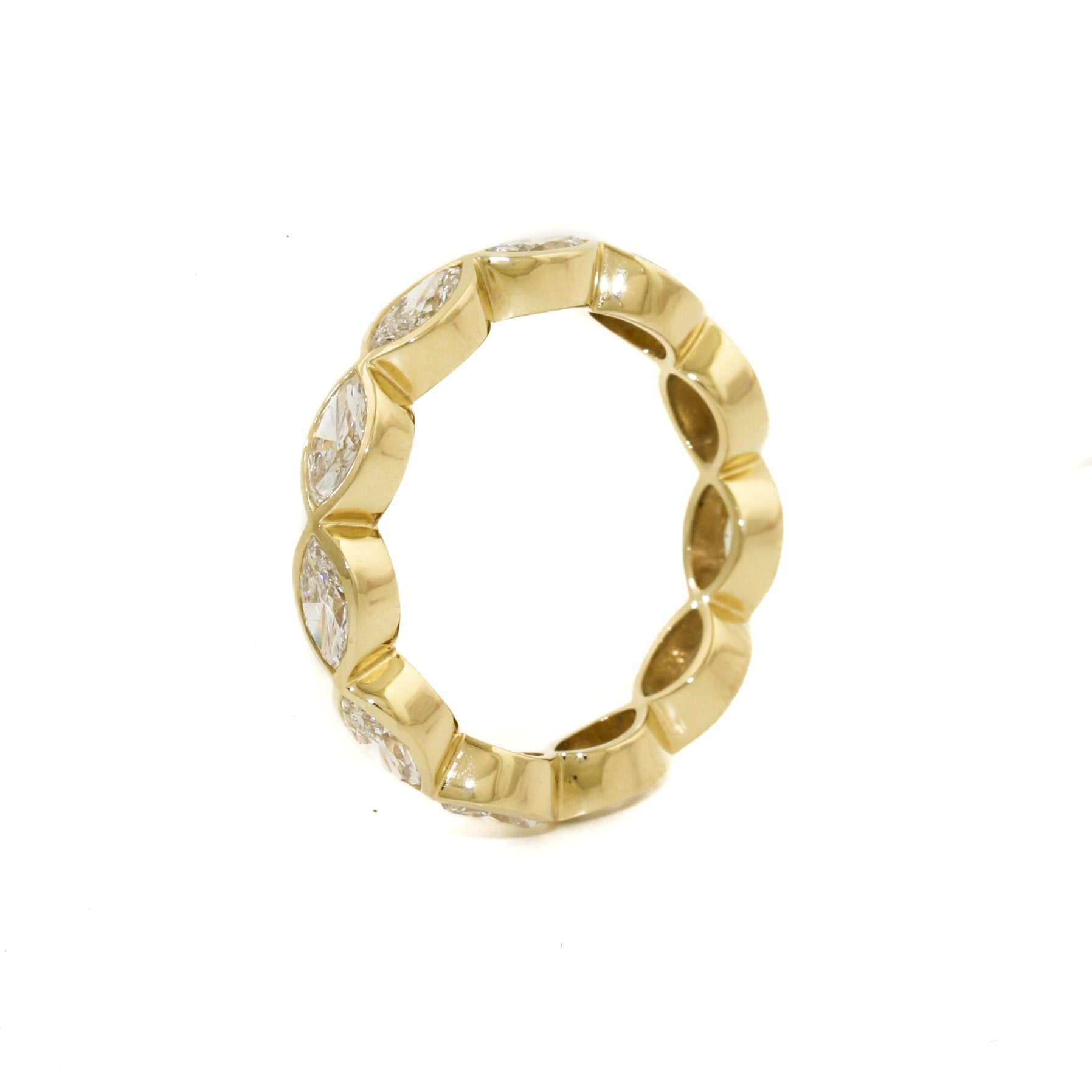 The band elegantly showcases the unique marquise cuts, creating a blend of classic allure and modern sophistication. Perfect as a wedding band, anniversary gift, or luxurious everyday accessory, this ring embodies timeless beauty and craftsmanship.