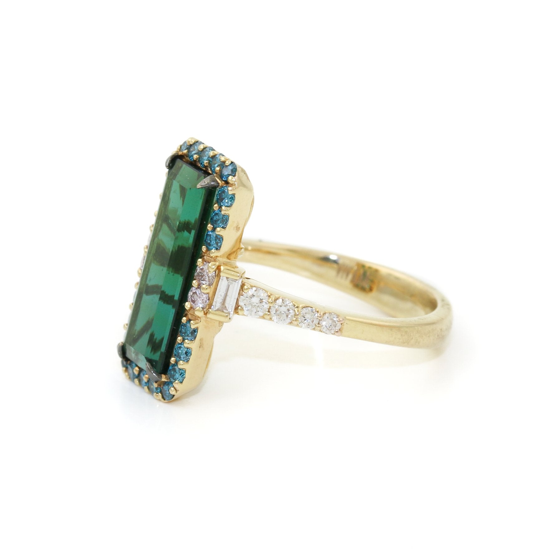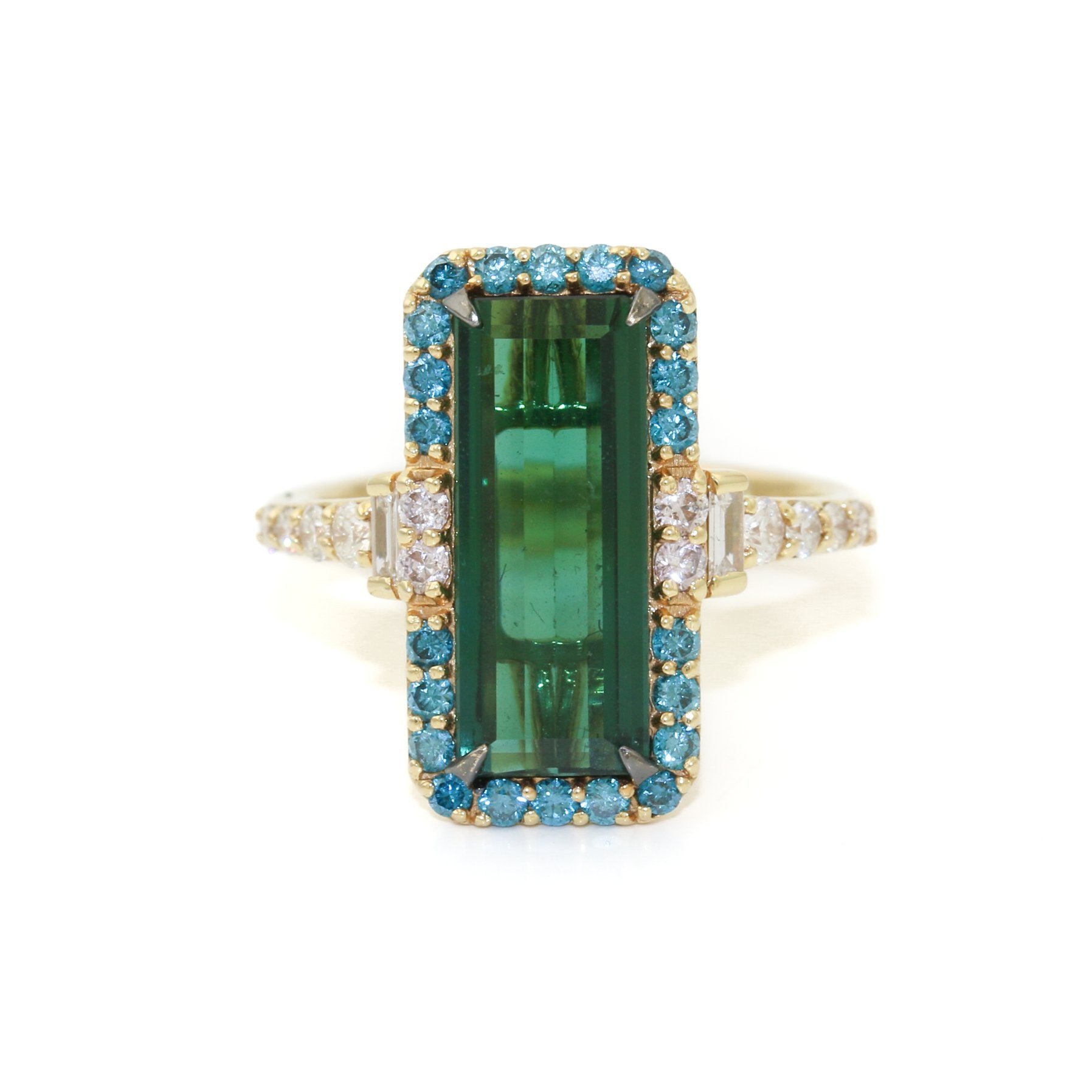 18k Gold x 3.62 ct Green Tourmaline & White and Blue Diamond Ring