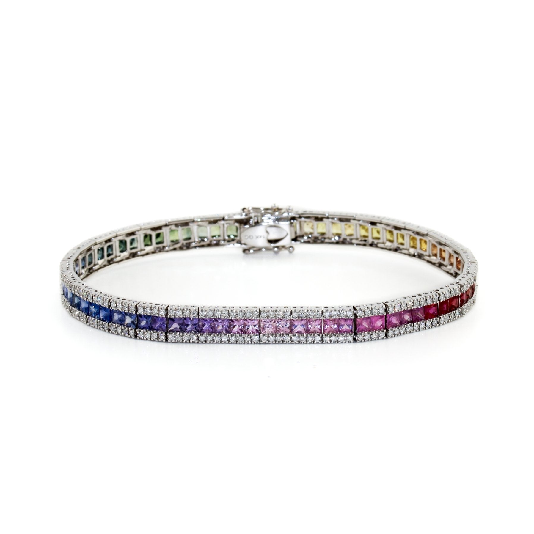 A stunning tennis bracelet made in 14k white gold, featuring channel set princess cut Sapphires arranged into a rainbow and Pave diamonds. Providing a clean, sleek yet eye-catching design.