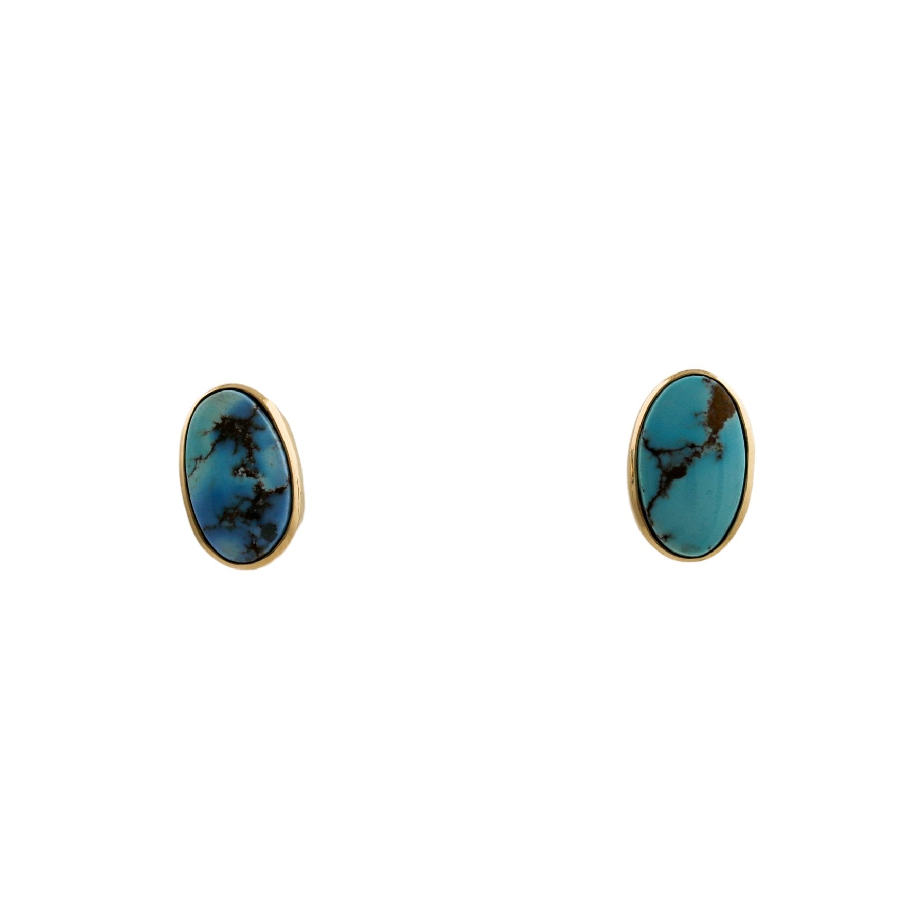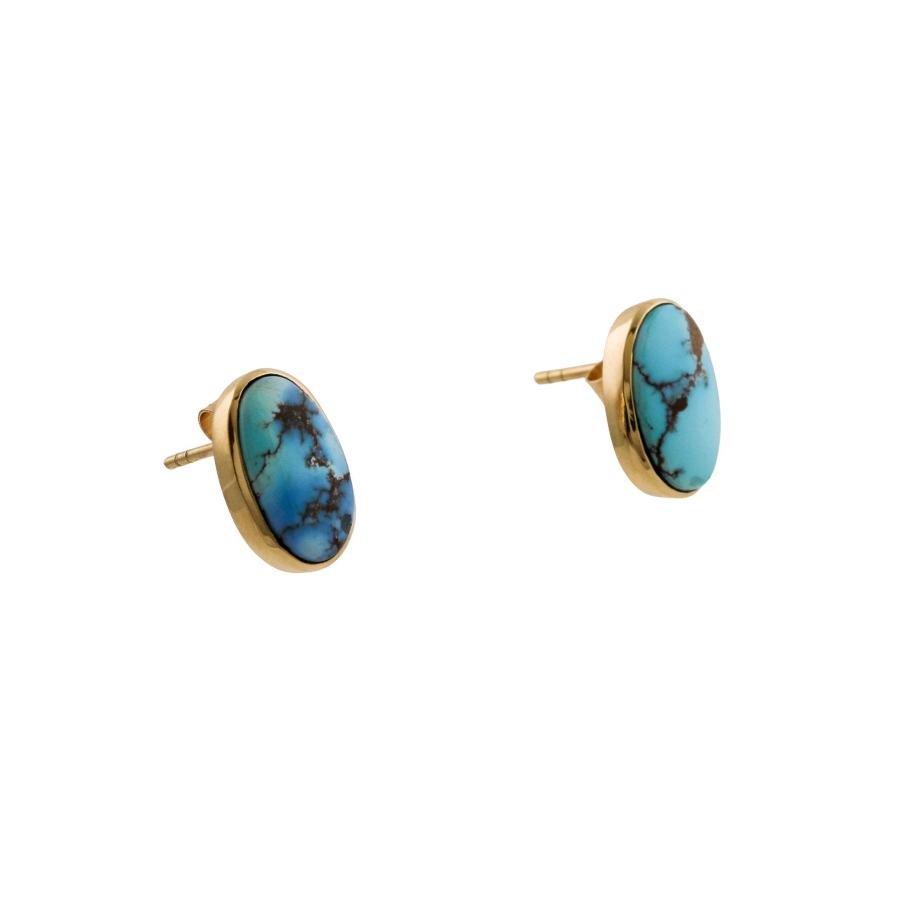 The fine gold setting adds a touch of luxury to the design and provides a warm contrast to the bright blue of the turquoise. As studs, these earrings have a post that goes through the earlobe and a backing to hold them securely in place.