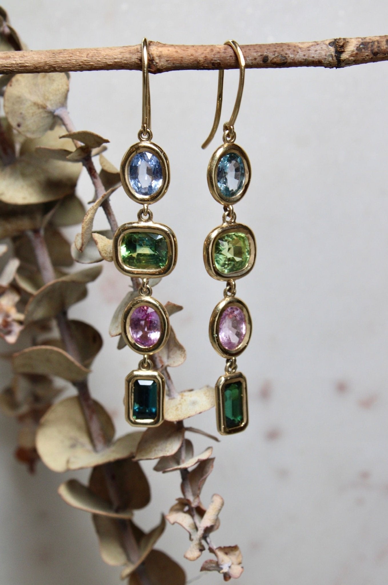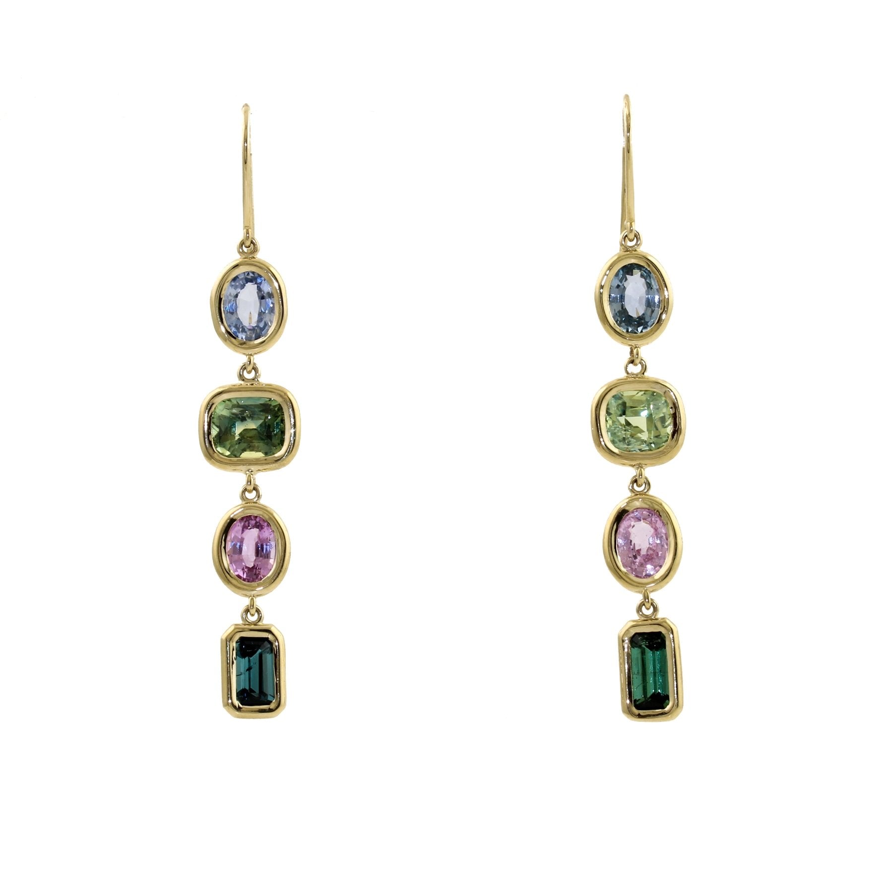 These stunning drop earrings feature a total of 6.5ct of Sapphires in an array of tones; blues, pinks and greens bezeled in 14k yellow Gold. Sapphires are one of the most precious gemstones making this set a fantastic edition to your fine jewelry collection.