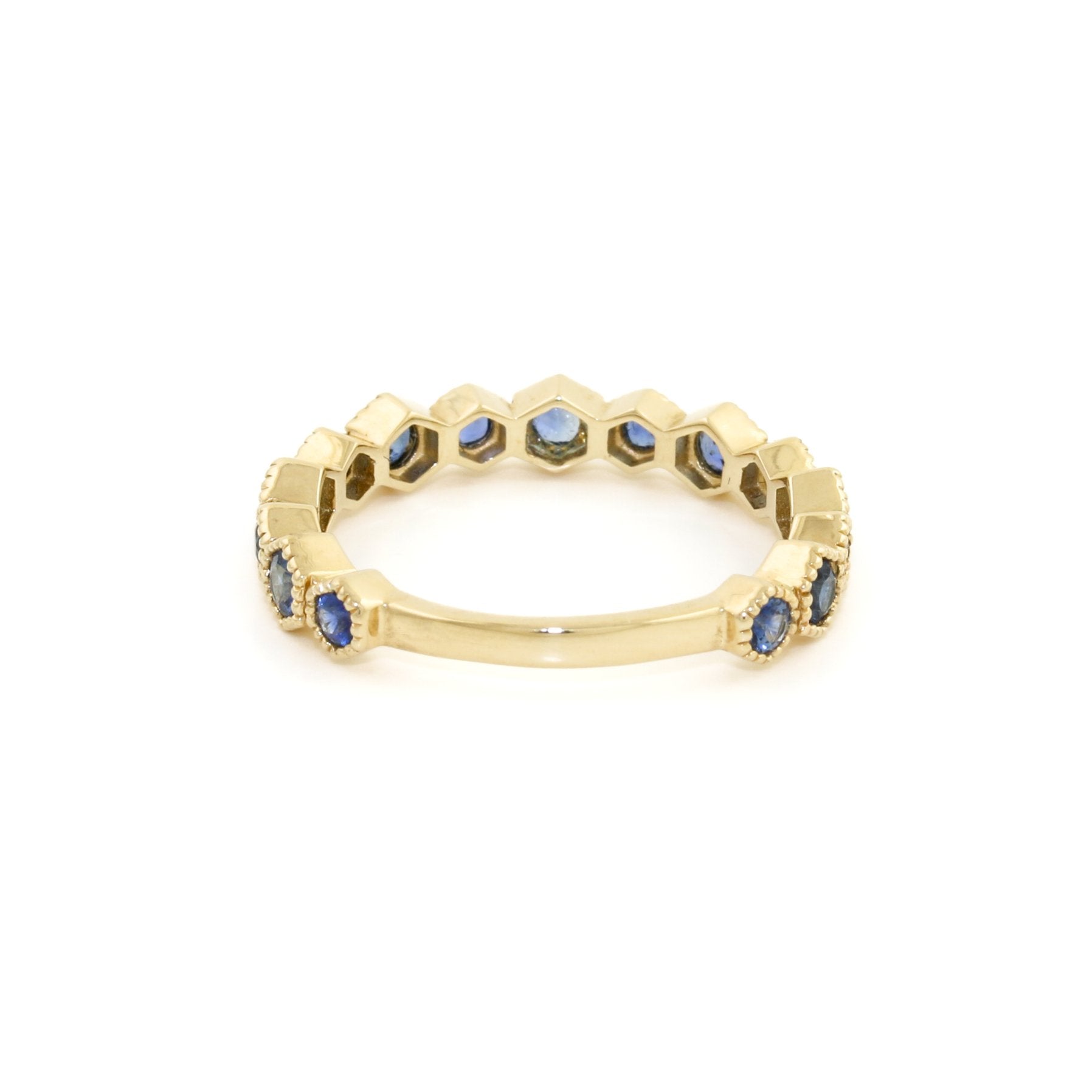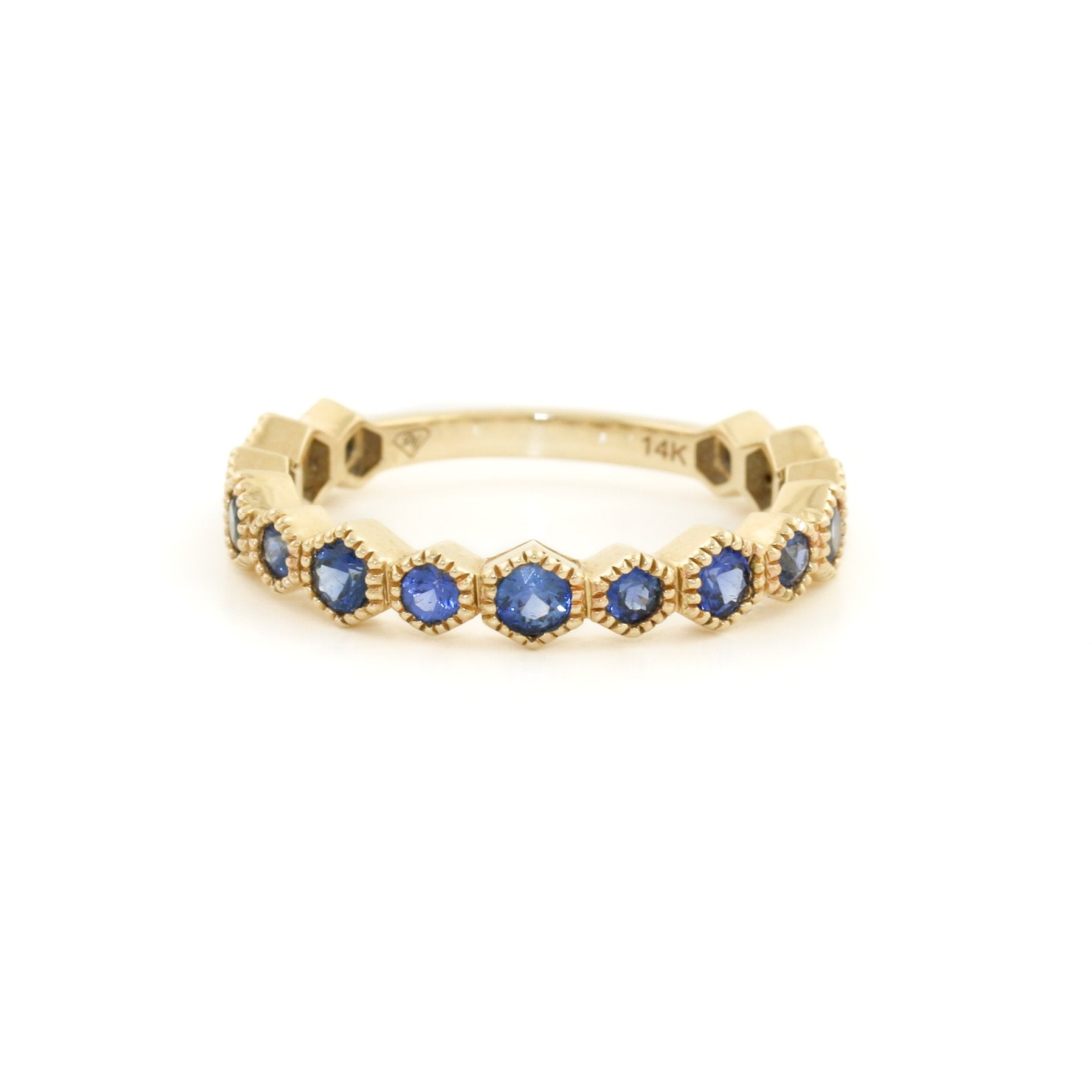 This semi-eternity band sets the standard for beauty and elegance. Fashioned in 14k gold, the ring is designed with a half-shank hexagon pattern with milgrain-detailed edges, bedecked with 15 round blue sapphires. These deep blue stones paired within the luxurious gold design are a guaranteed conversation starter.