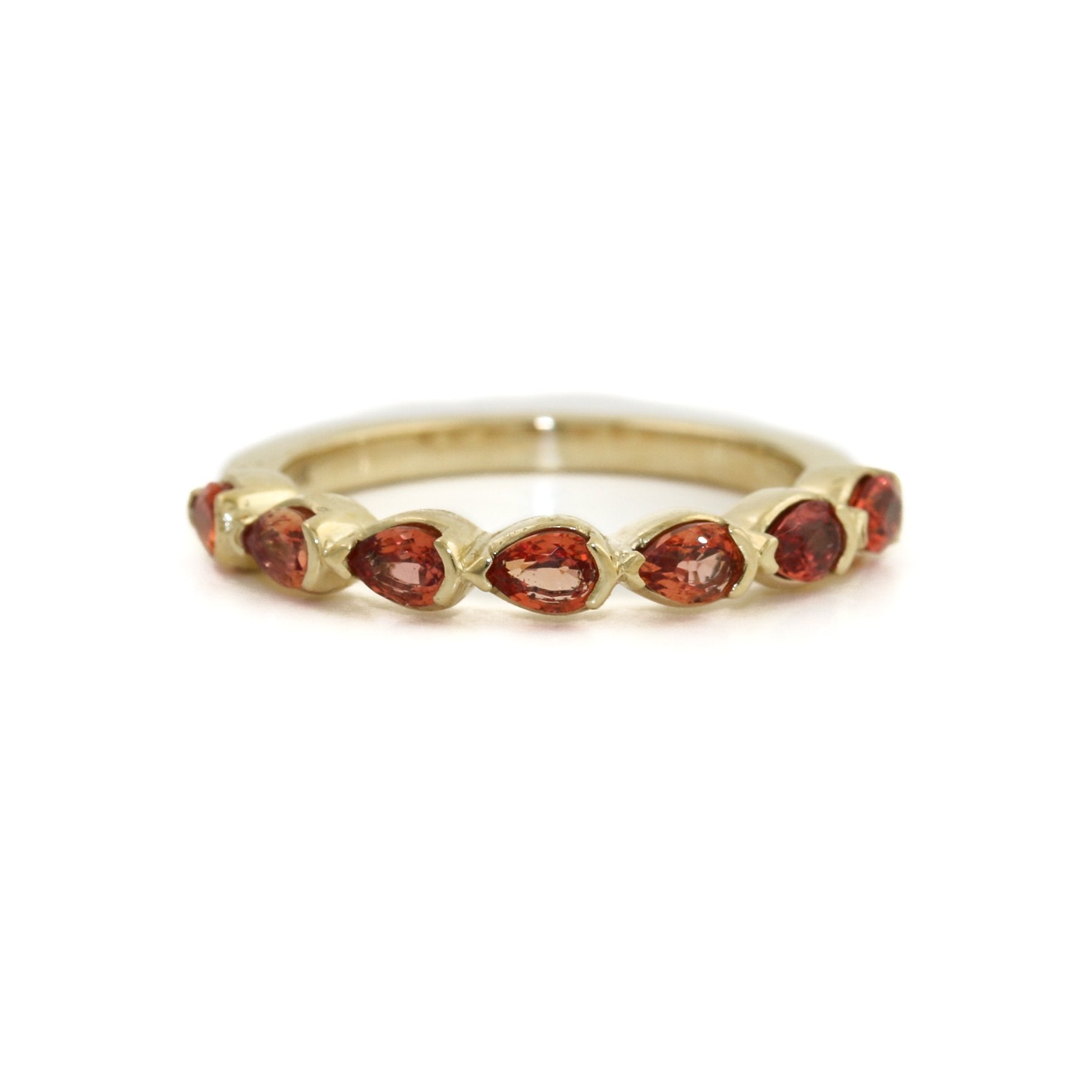 Introducing our alluring Peach Padparadscha Sapphire Band in 14K Gold, an enchanting blend of elegance and charm. This exquisite band features a mesmerizing collection of pear-shaped peach sapphires, expertly set in radiant 14K gold.