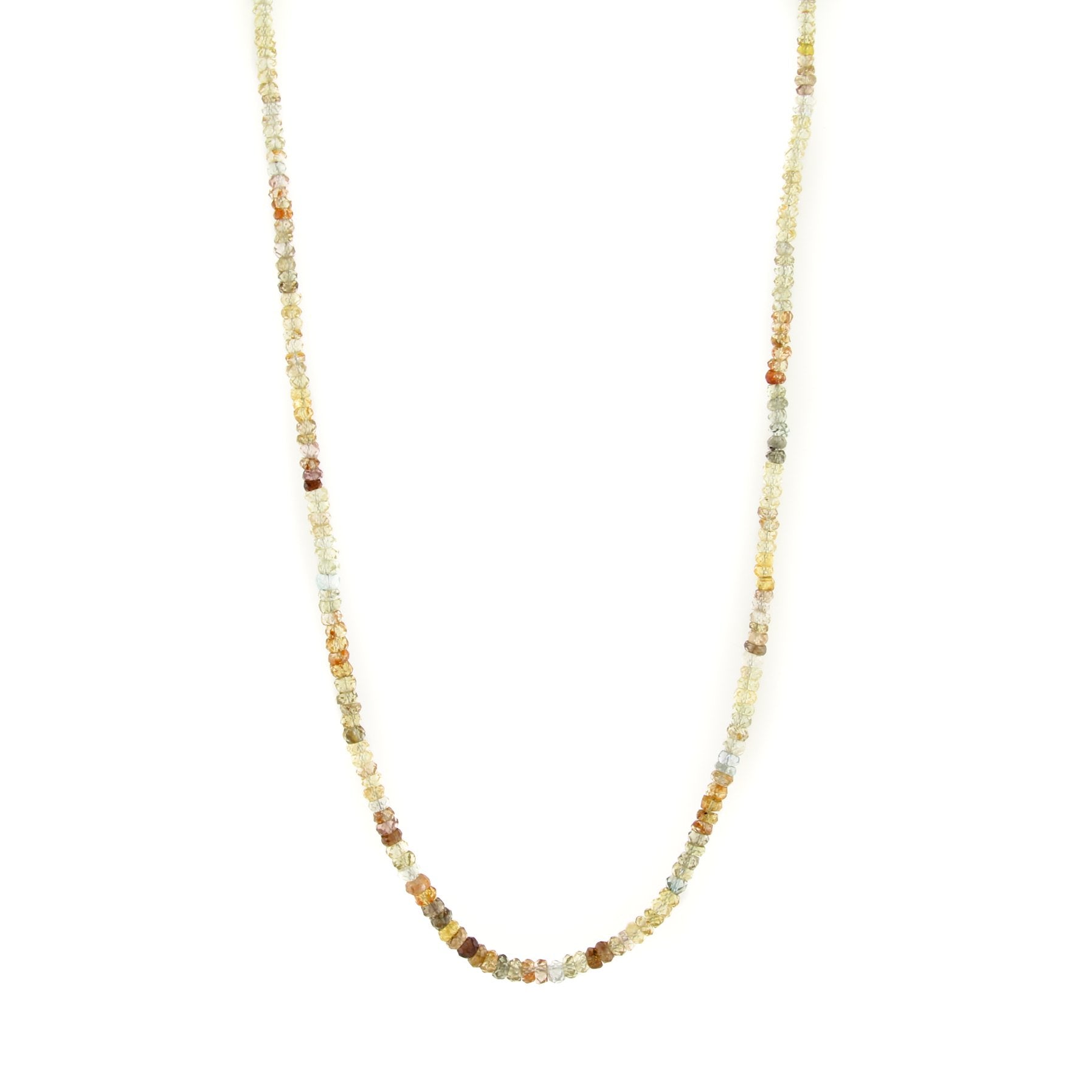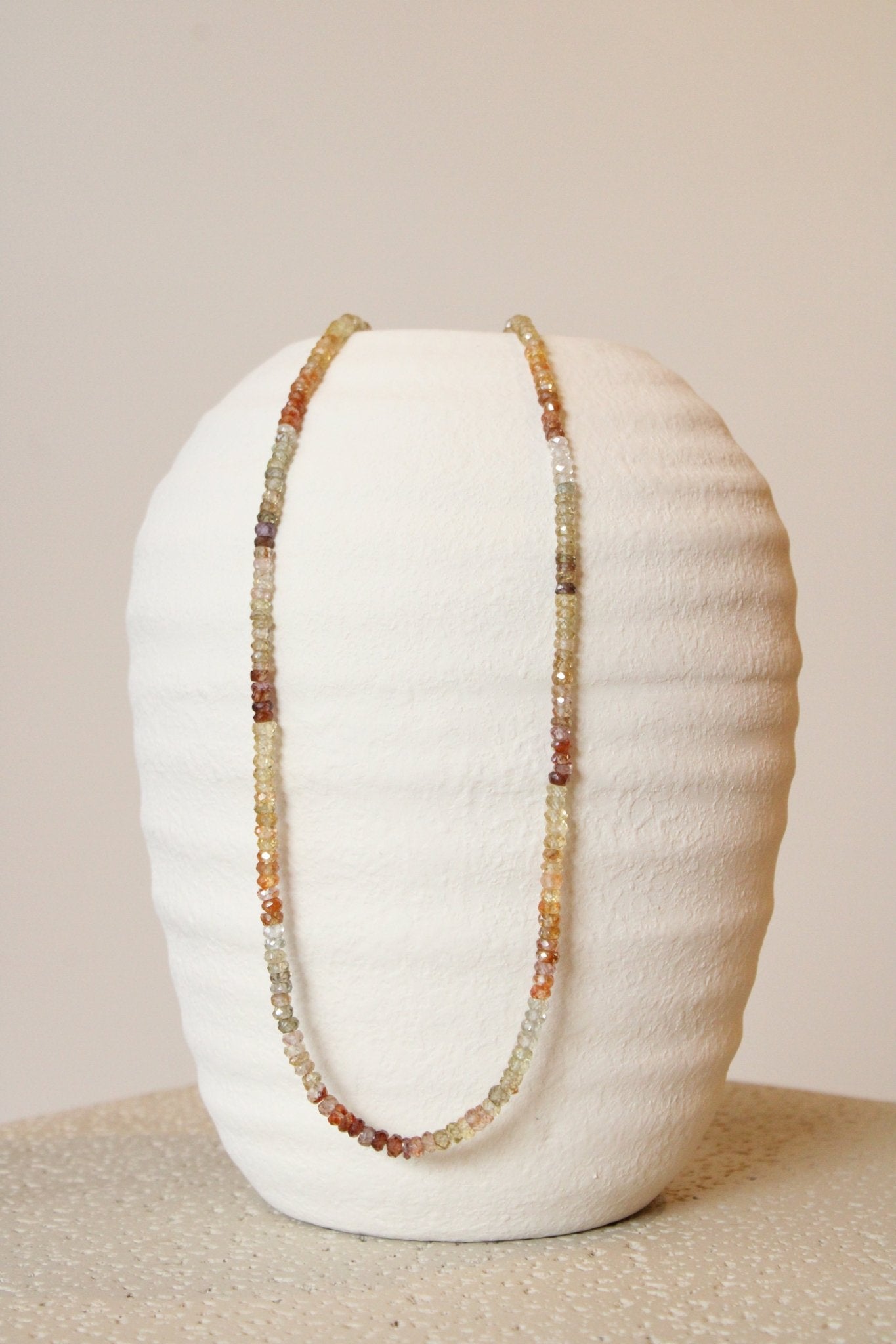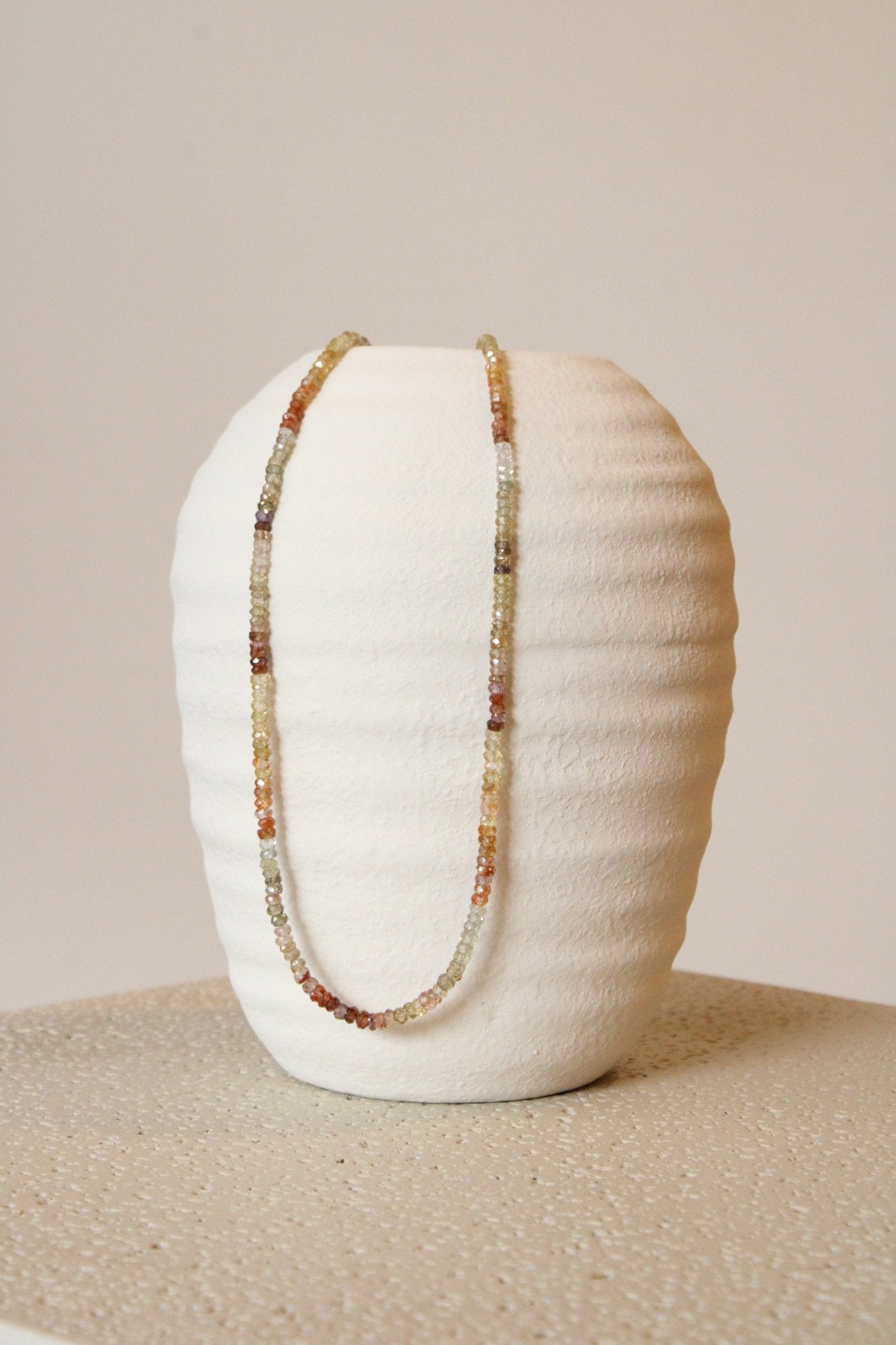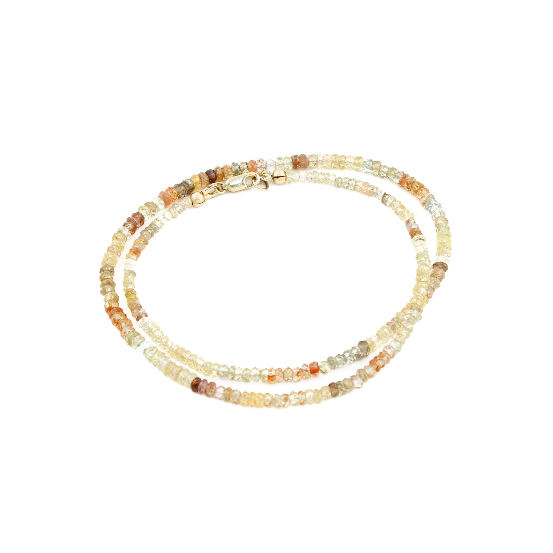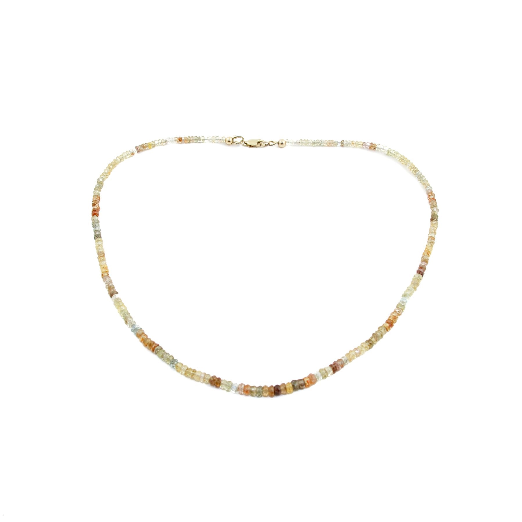 The gradient of this zircon-beaded necklace captures the turn of seasons. 'Solstice' reminds us of impermanence and the beauty that comes with such fluidity. As summer unfurls into autumn, the colours of these faceted beads carry earth tones of amber, brown, buttery yellow and pale blues, reflecting such changes. Hand-strung and designed by us in our flagship store in Vancouver, BC, we personally sourced these zircon beads with the intention of creating a piece that is wearable and uniquely yours. The piece is finished with a sturdy 10k yellow-gold lobster clasp. Enjoy this pretty beaded necklace paired with your favourite gold chains and charms.