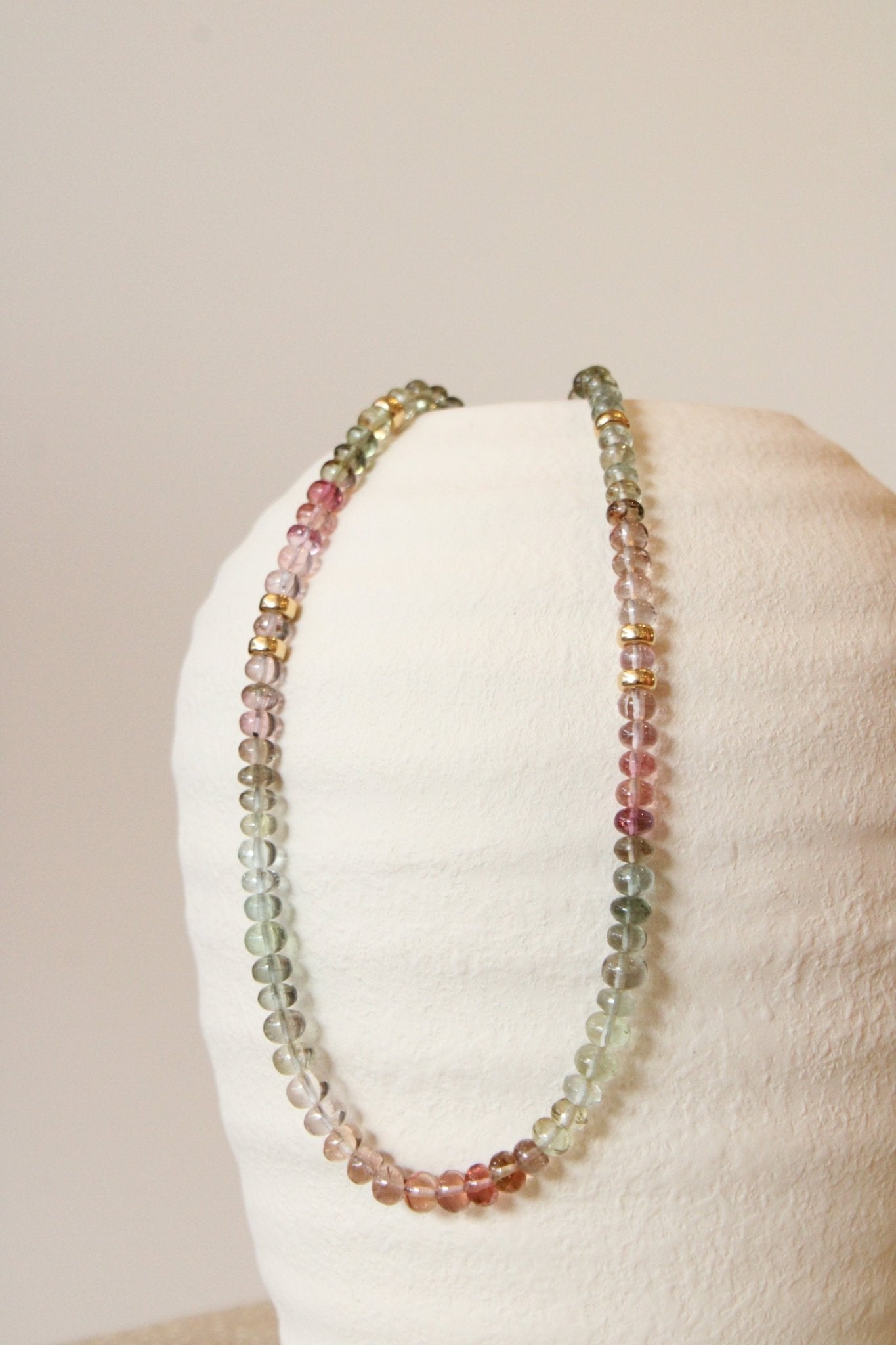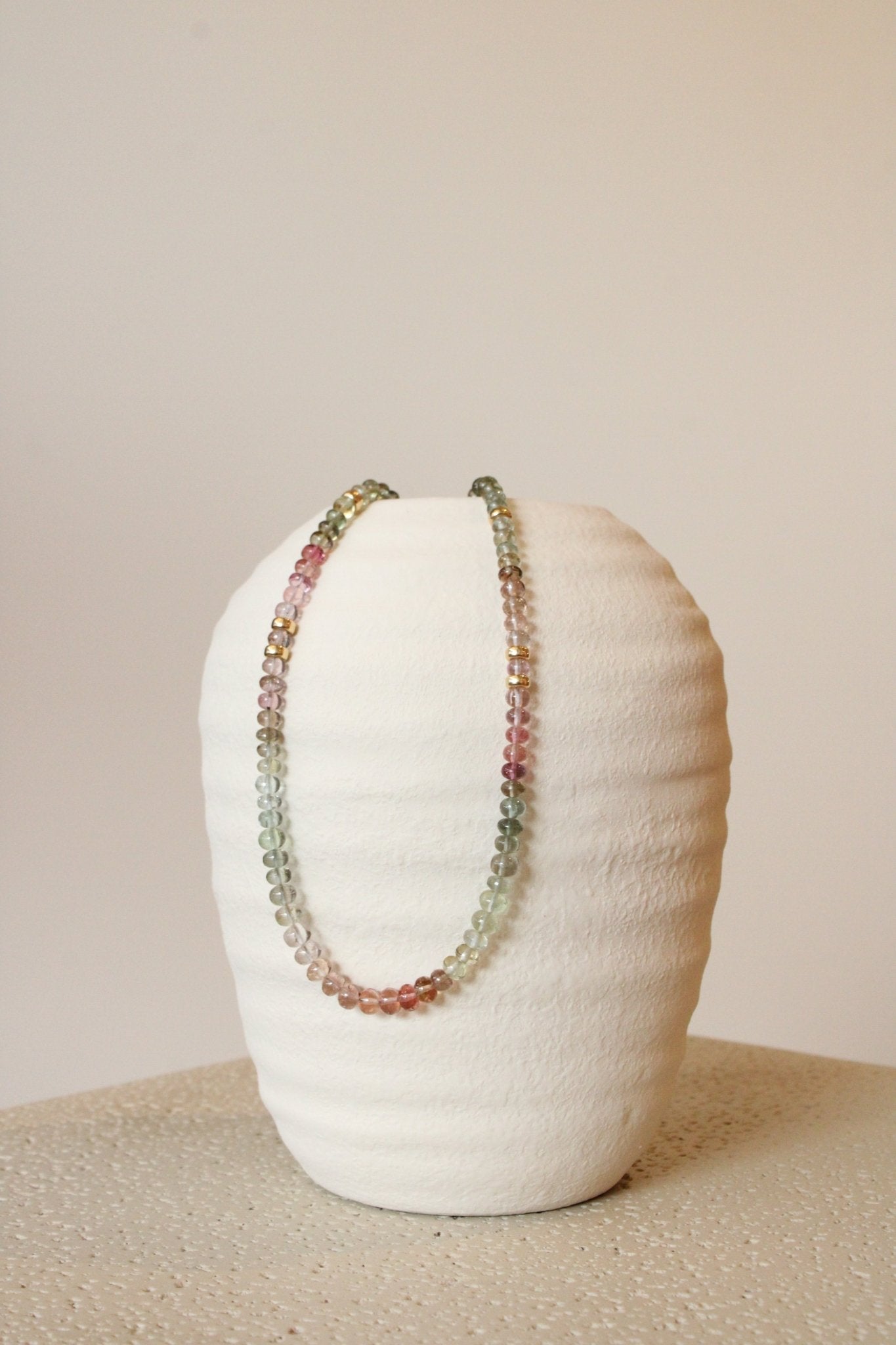Handcrafted and designed at our flagship store in Vancouver, BC, the 'Wild Flora Tourmaline Beaded Necklace' is a true labour of love. We personally sourced these tourmaline and gold beads that reminded us of the delicate nature seen in wildflower meadows; here, we were inspired to create a piece of jewelry that is both wearable and uniquely yours. Pair this piece with your favourite gold chains and charms for a delectably original stack.