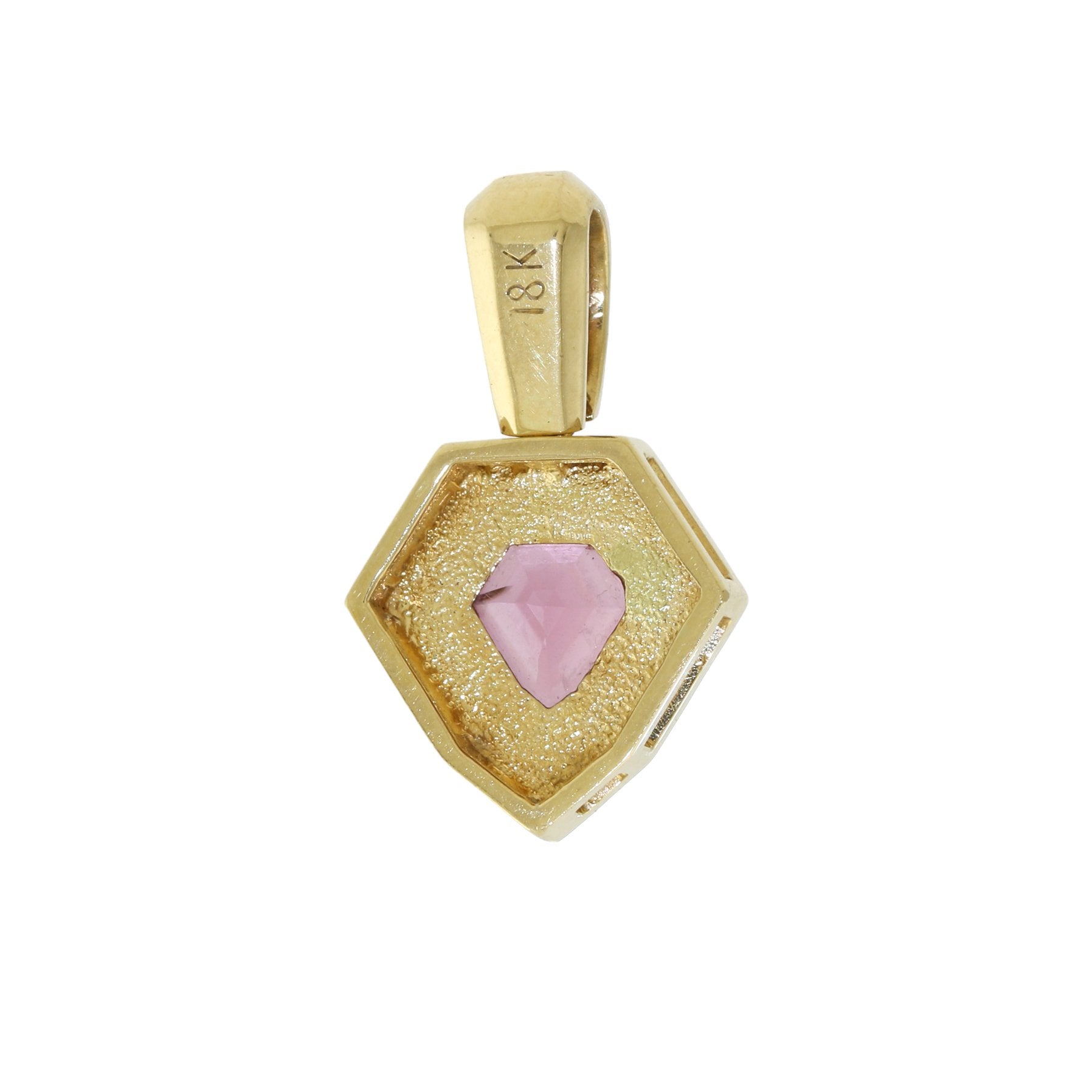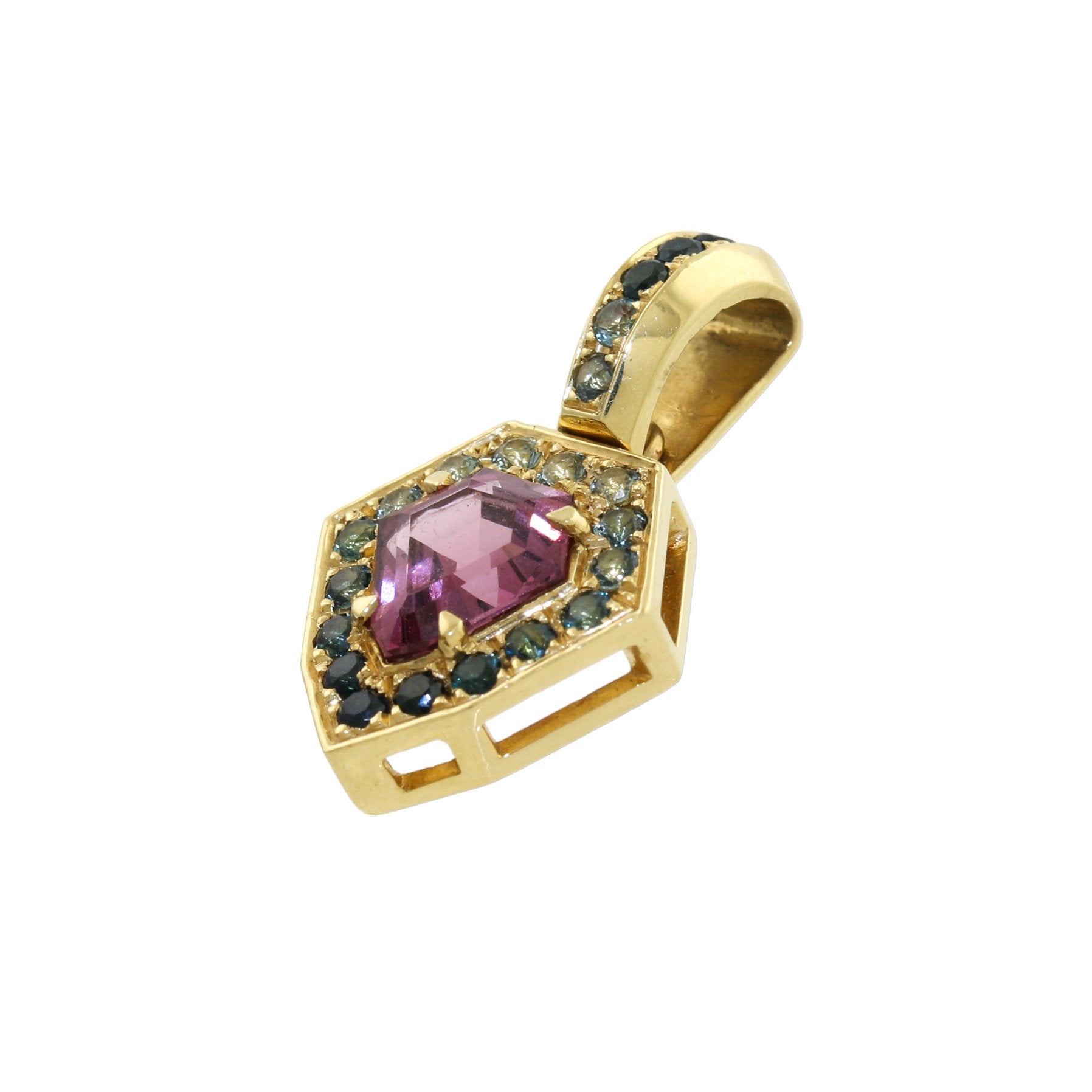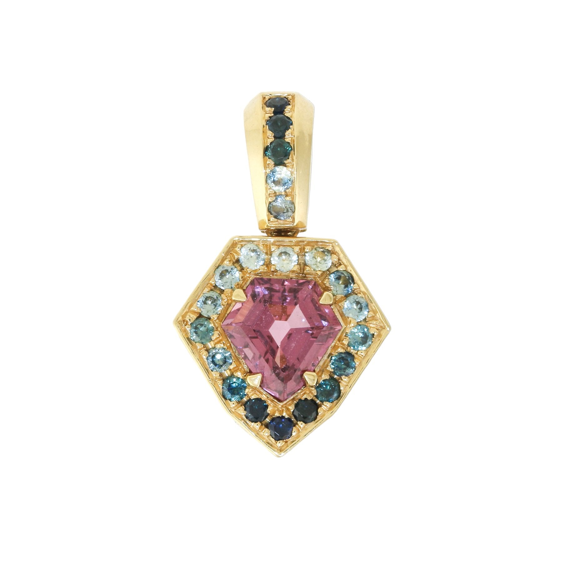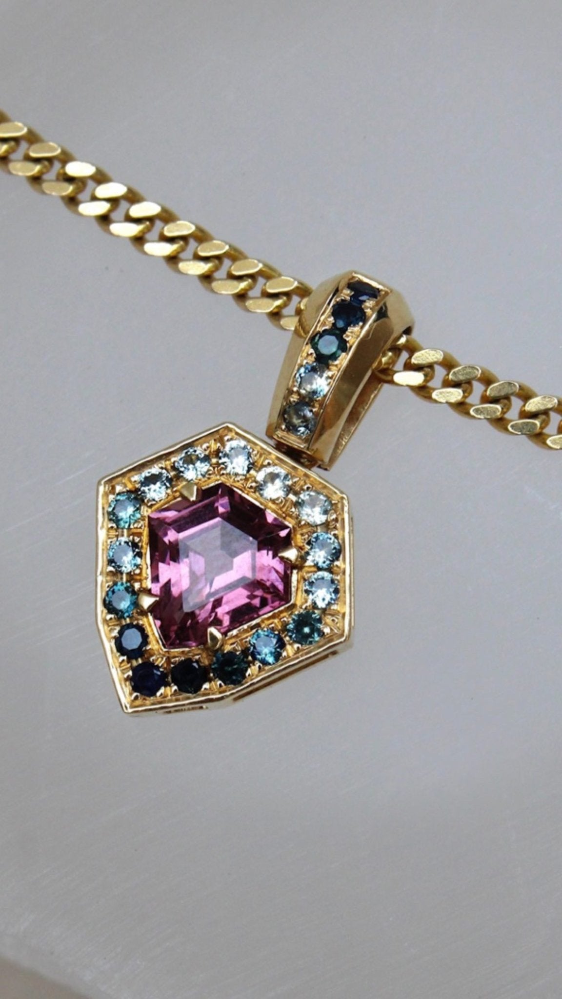 The Aurora pendant awaits to be the most beautiful addition to your stack. This geometric, art deco-inspired pendant features a brilliant gradient of teal sapphires, surrounding the stunning spinel centre stone. These vibrant hues of blue and green compliment the magenta centre beautifully, each colour working with the other in an alluring contrast. This pendant is a true masterpiece, with each stone hand cut and hand set into an 18k yellow gold bezel.