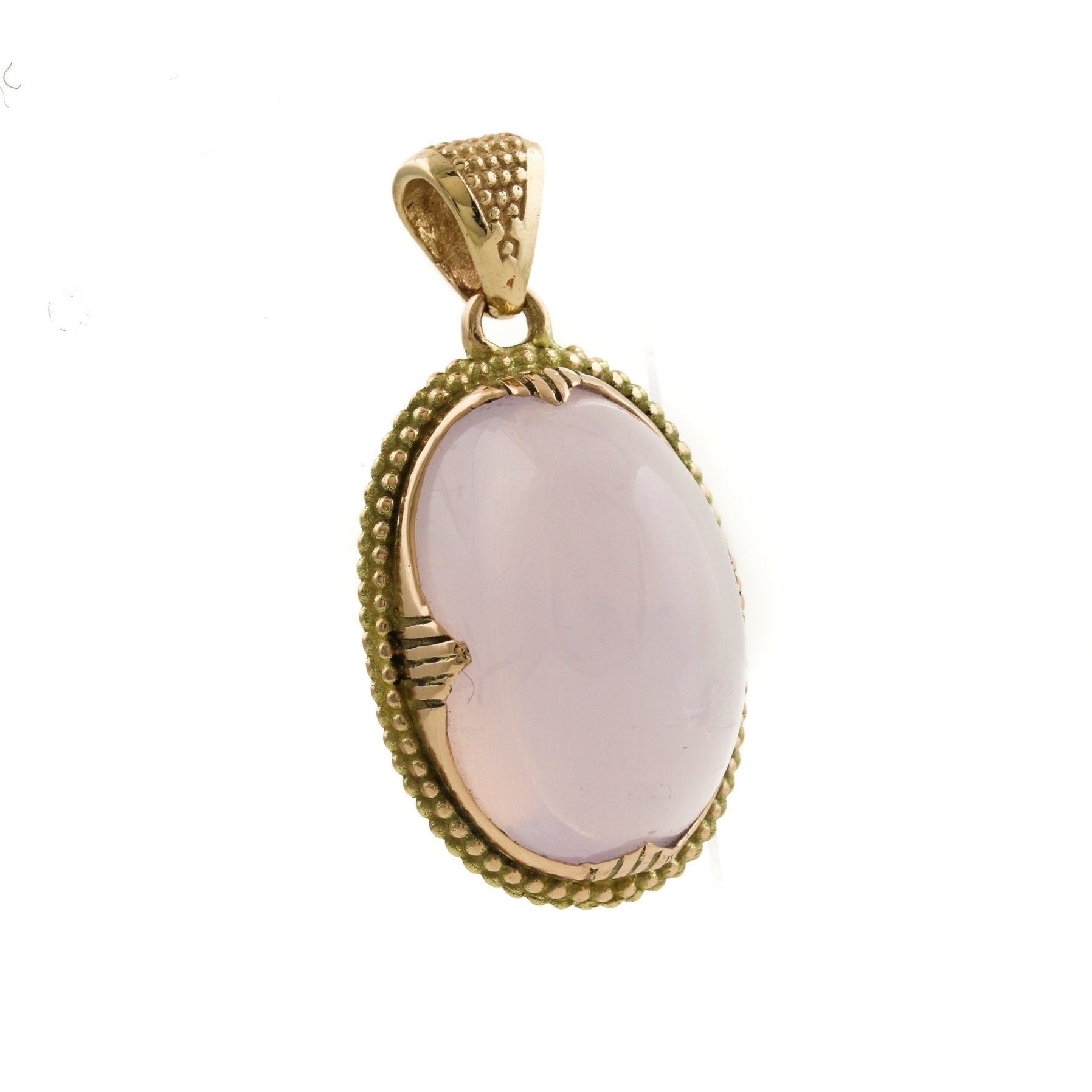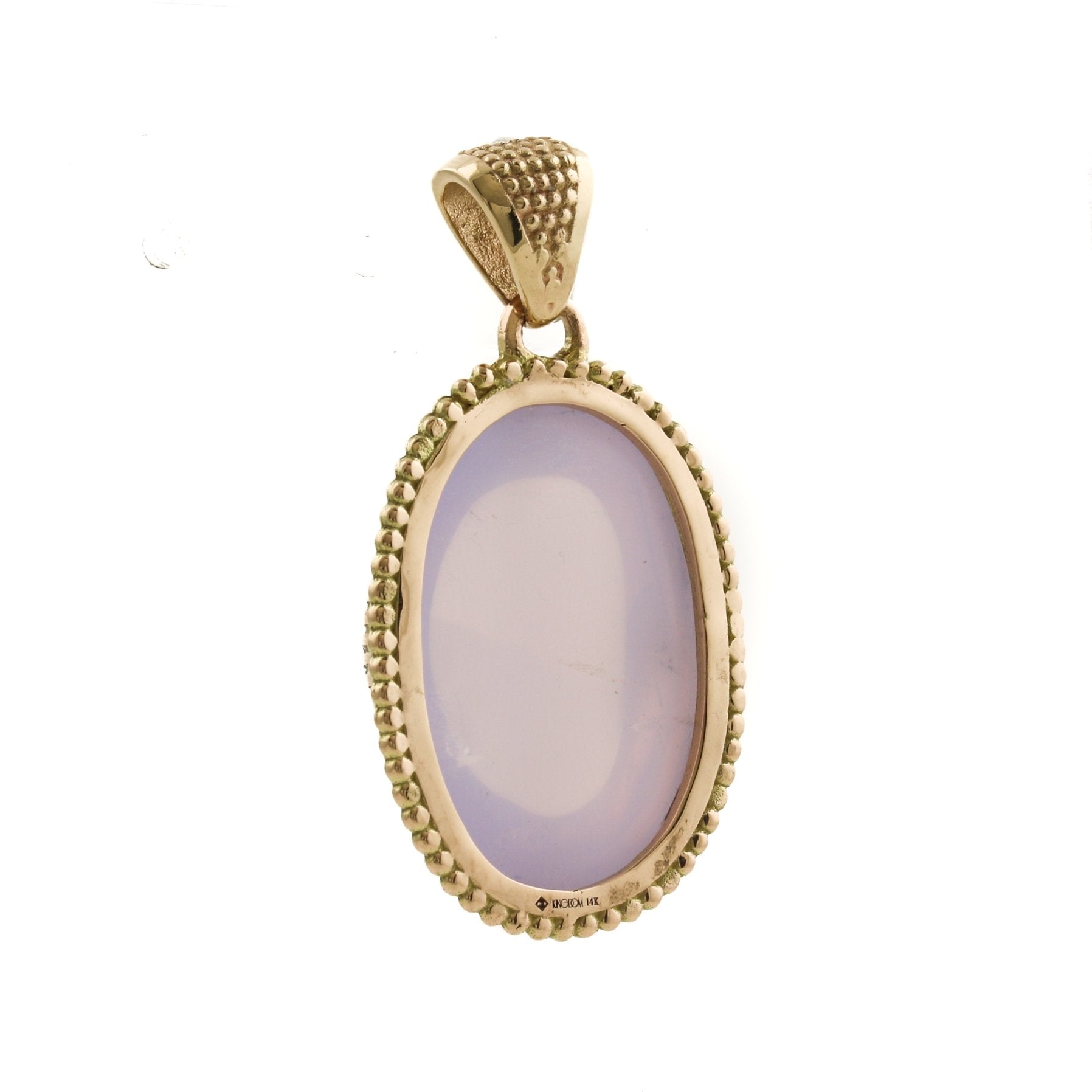This stunning 14k gold pendant features an oval-shaped lavender quartz gemstone in a beautifully detailed bezel. The intricate design of the bezel is a true masterpiece. The rich, warm glow of the 14k gold is the perfect backdrop for the rich, deep purple hues of the lavender quartz, creating a truly eye-catching piece of jewelry. Whether worn with a simple gold chain or paired with other pieces from your jewelry collection, this pendant will surely become a cherished piece that will bring joy and beauty to your life for years to come.