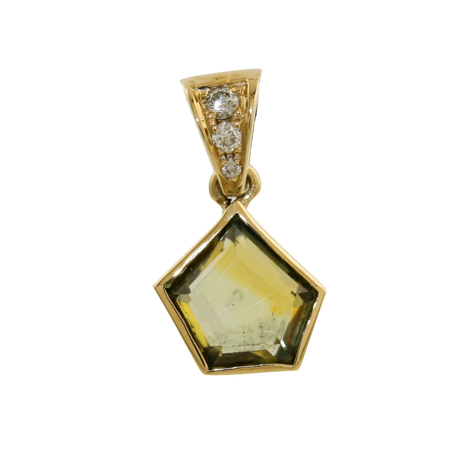 With its striking diamond bail and angular centerpiece of mesmerizing blue Montana sapphire, it is sure to capture the attention of all who behold it. Let yourself be entranced by the vibrant coloring of greens and yellows making it a timeless beauty destined to become a cherished part of your jewelry collection for years to come.
