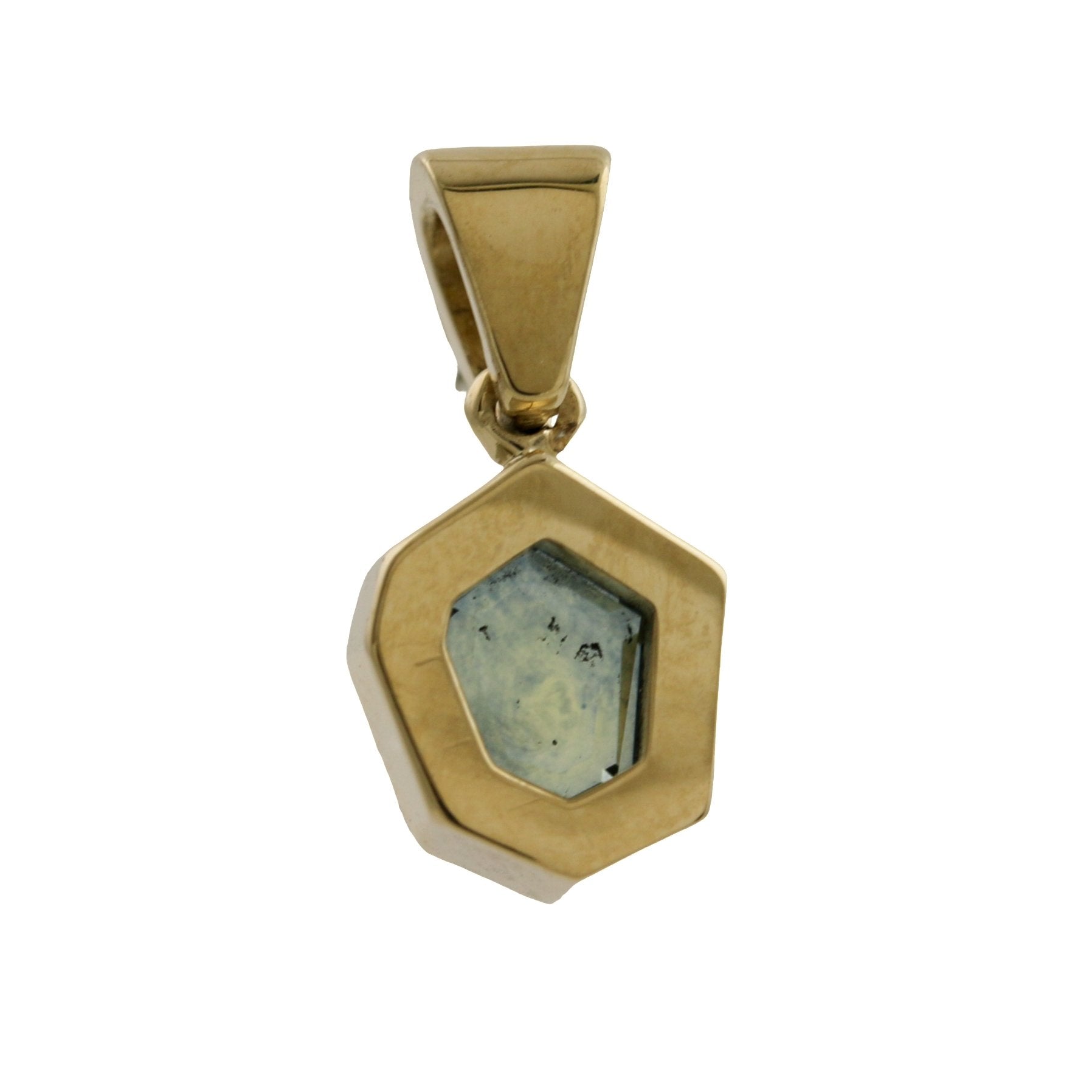 Made from 14k gold and featuring a diamond bail and a stunning angular, portrait cut, blue Montana Sapphire.