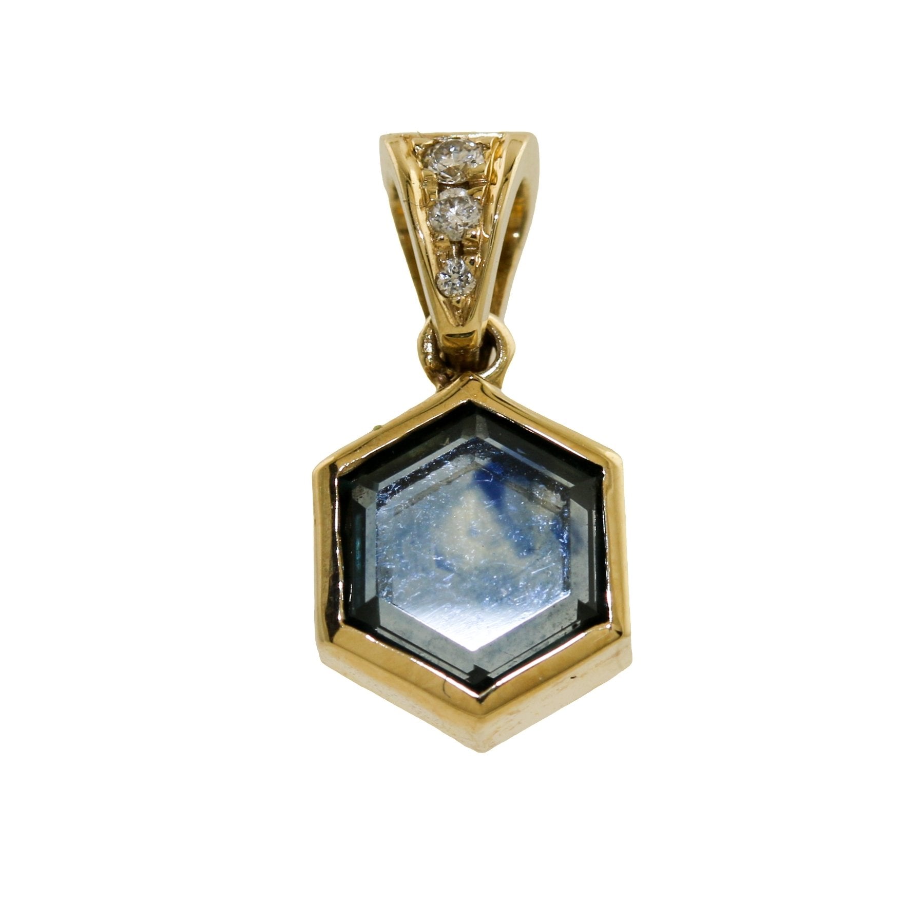 Made from 14k gold and featuring a diamond bail and a stunning angular, portrait cut, blue Montana Sapphire.