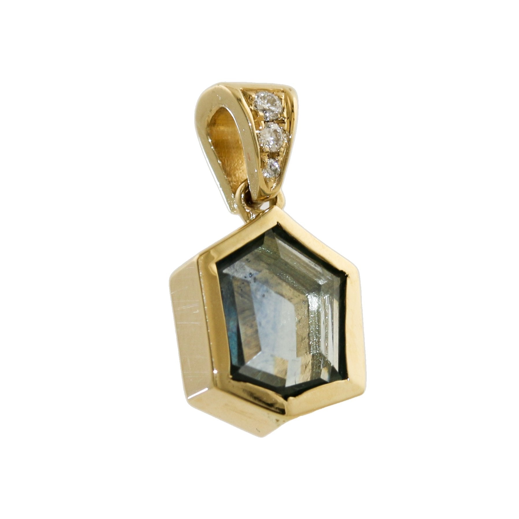Made from 14k gold and featuring a diamond bail and a stunning angular, portrait cut, blue Montana Sapphire.