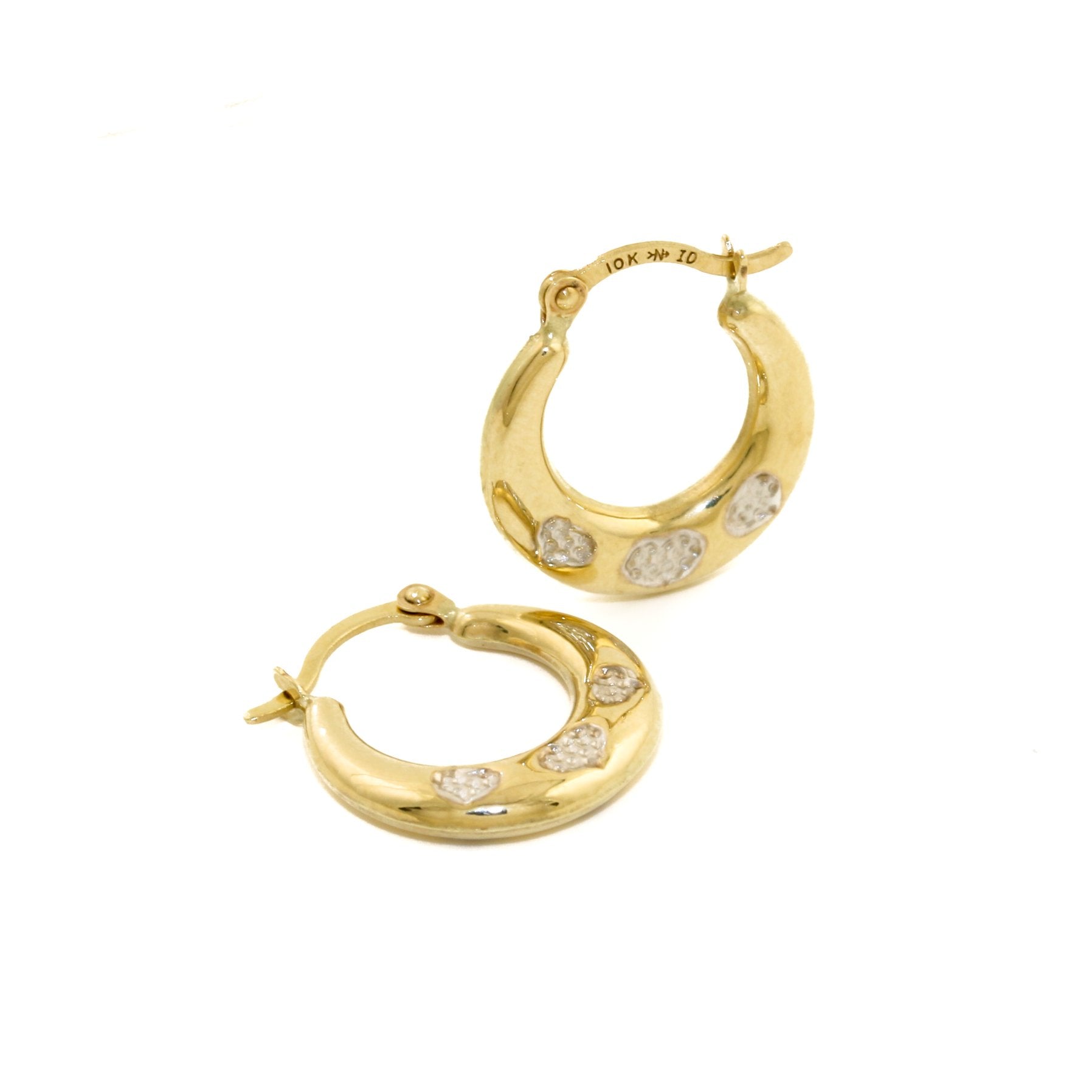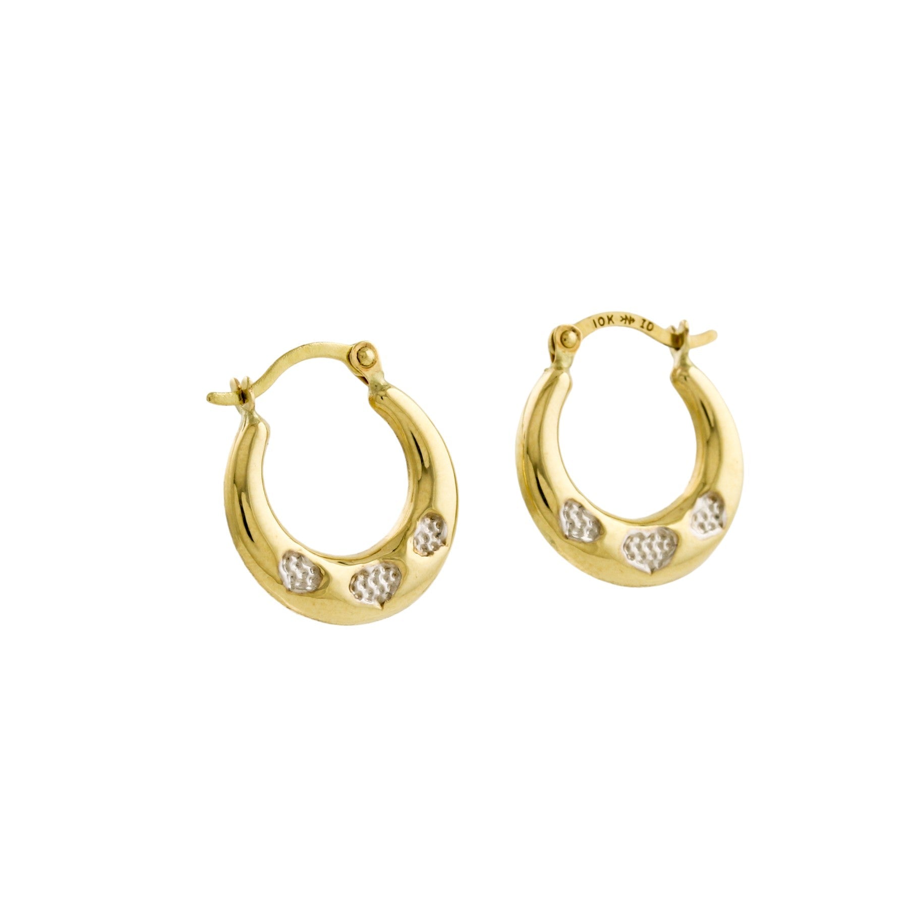 Elevate your style with these charming 10K gold Creole hoop earrings. Each earring showcases a trio of delicate heart motifs, beautifully crafted in a contrasting two-tone design that blends the warmth of yellow gold with the subtle sheen of white gold. The intricate detailing on the hearts adds a touch of texture and dimension, making these earrings a versatile choice for both casual and elegant occasions.