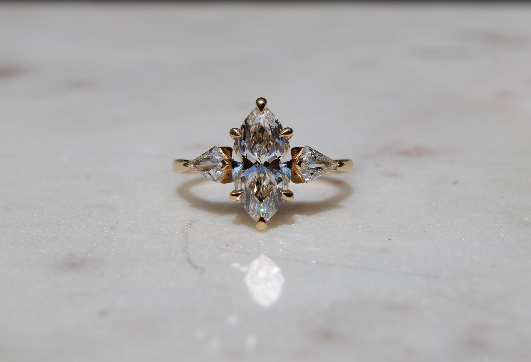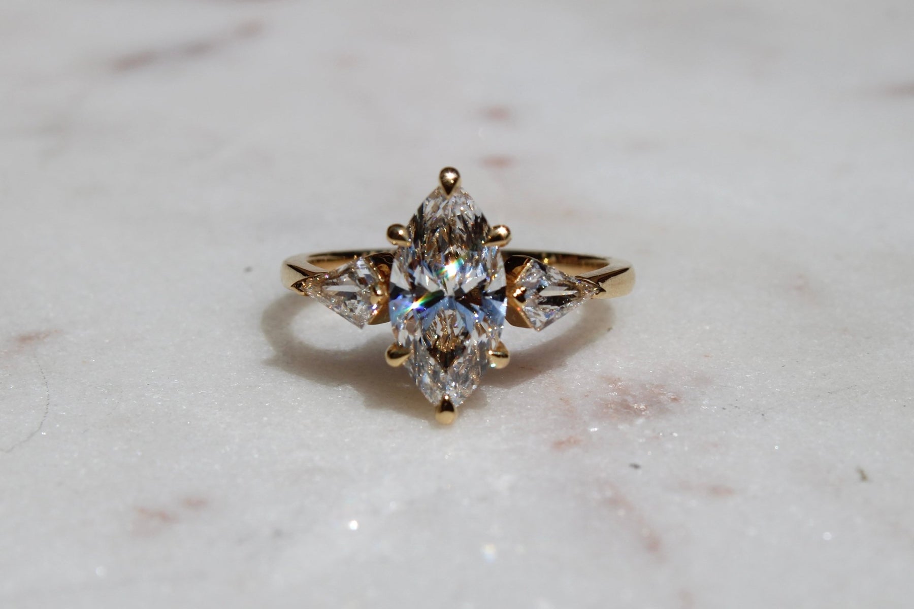 This stunning engagement ring features an elegant marquise lab diamond as its centre, paired with two striking .26ct kite lab diamonds, creating a contemporary yet timeless piece to wear for lifetimes.