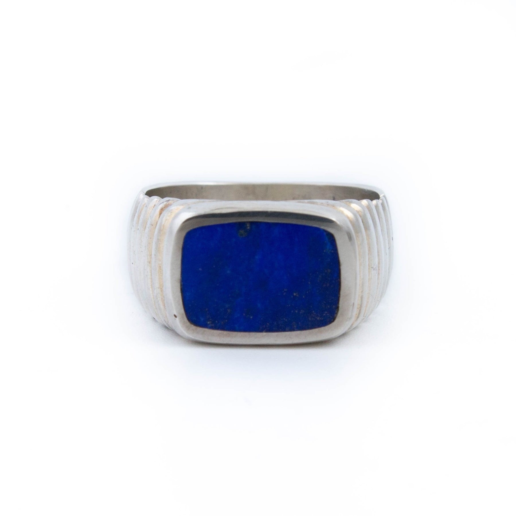 Incredible contemporary inlay signet ring, featuring an impressive example of deep cobalt blue lapis lazuli in a sleek setting. Comprised of sterling silver, this handmade piece has a ridged textured shank that showcases a beautifully serene specimen that's perfect for everyday wear.