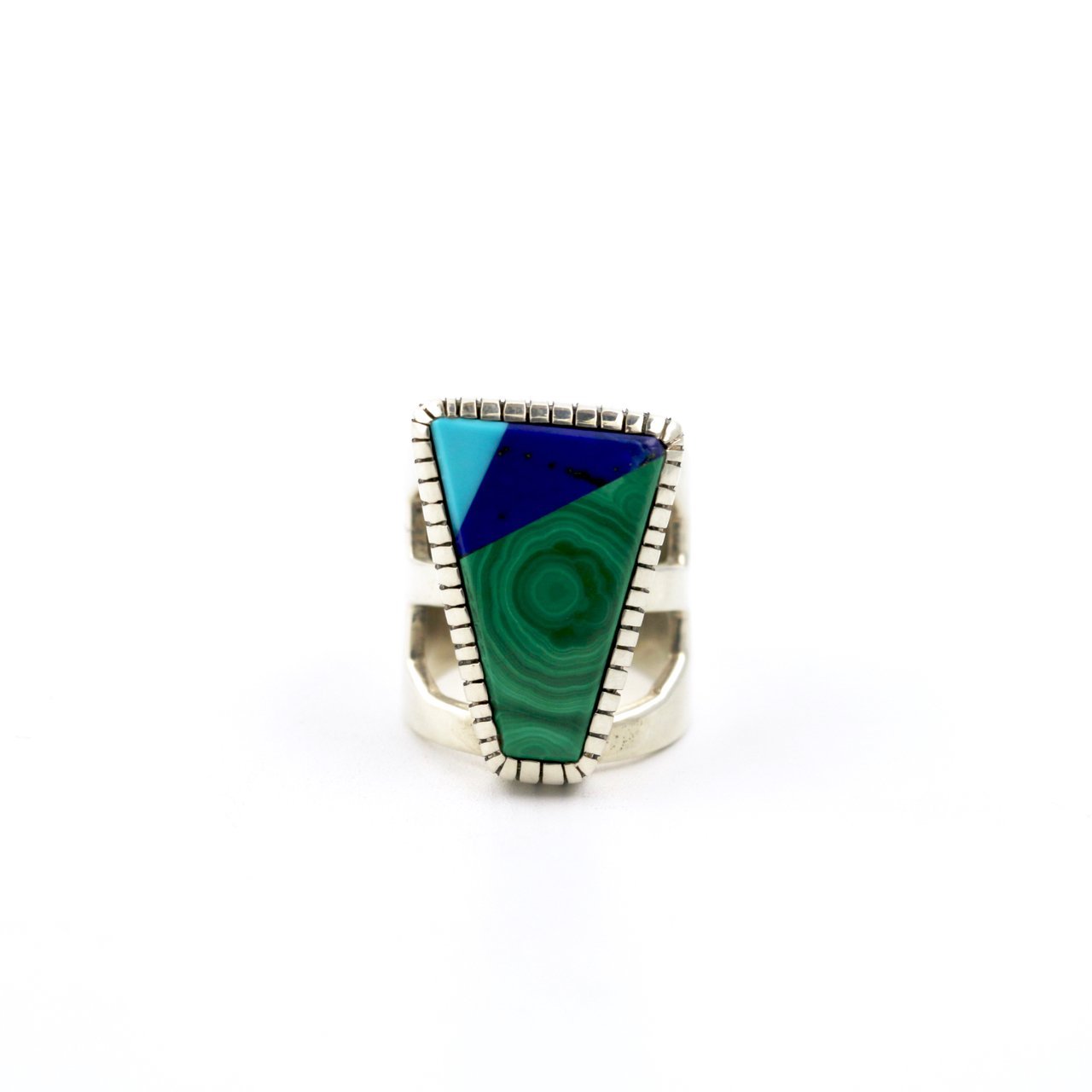 A spectacular, multi-coloured Intarsia Ring by Kingdom. Cut and set in a Triangular shape, this piece proves that you can never have to much of a good thing. Featured is a combination of Lapis Lazuli, Malachite, and Sleeping Beauty Turquoise. An almost lost art within that's always appreciated and admired through the ages. A true mosaic of high grade stones it's best.