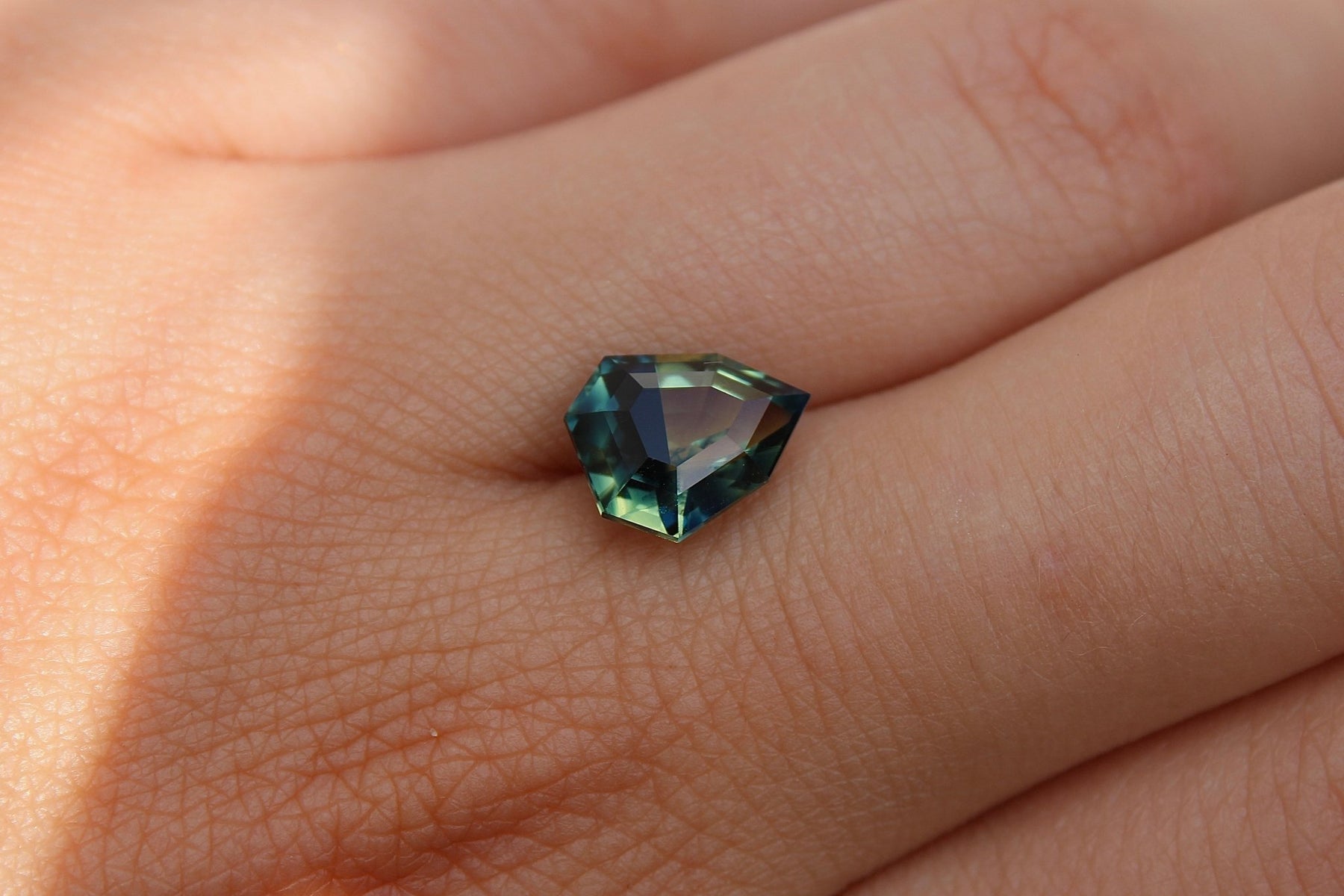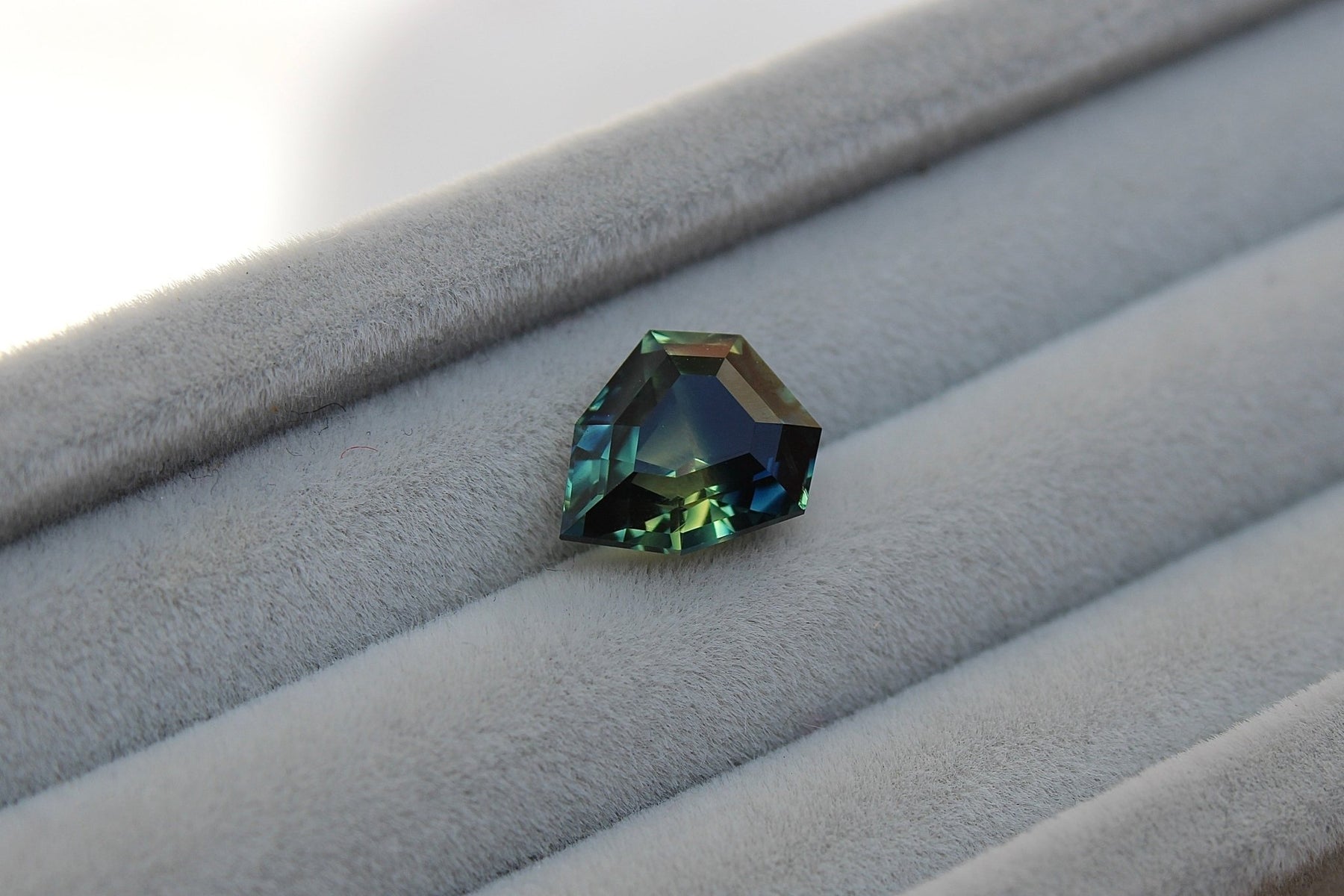 Create the ring of your dreams with this 3.23ct Fantasy cut pear-shaped parti sapphire. This utterly stunning gemstone catches an array of forest tones within its facets, ranging from fern to deep greens, making it a truly one-of-a-kind gemstone.