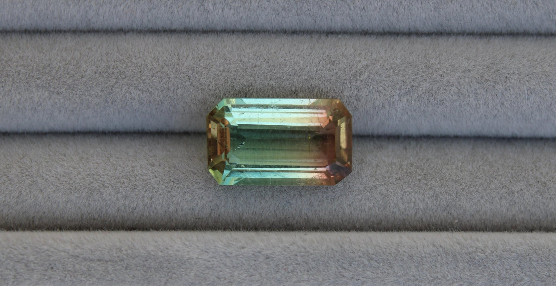 Create the jewelry piece of your dreams with this 4.48ct emerald cut bi-colour tourmaline. This utterly stunning gemstone catches minty greens and full tones of peach within its facets, making it a truly one-of-a-kind gemstone.