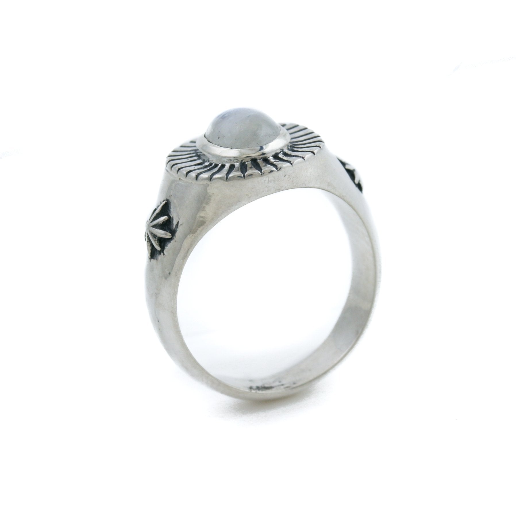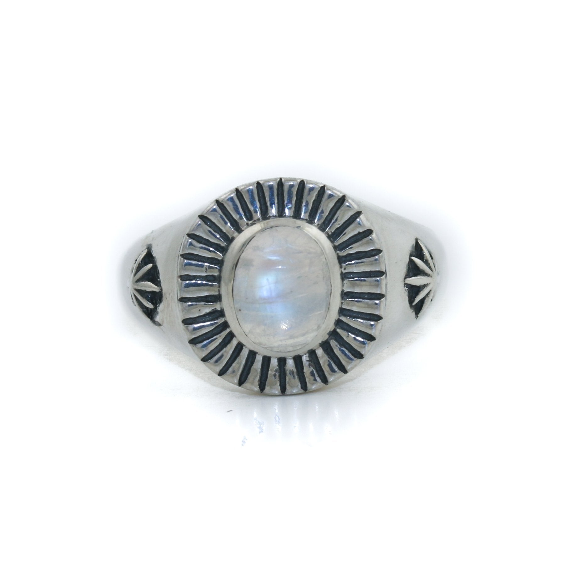 The moonstone at the center of the ring is surrounded by intricate line etching, adding depth and texture to the piece. As you gaze into the moonstone, the stars on the side of the ring catch your eye. Delicately etched into the silver, these stars add an element of magic and wonder to the ring.