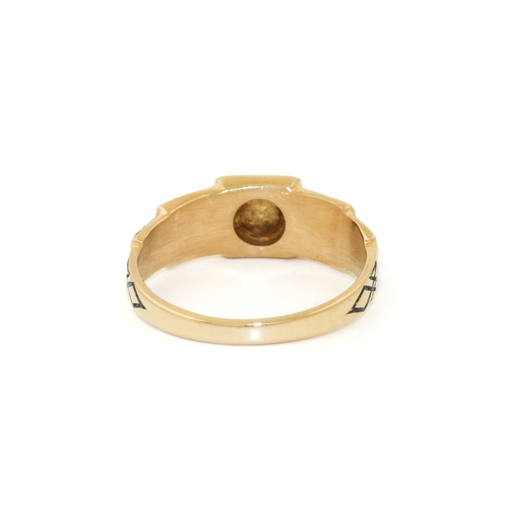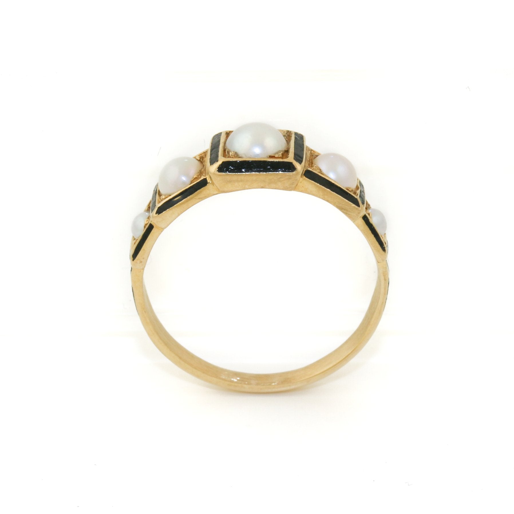 The black enamel trim symbolizes remembrance, a hallmark of mourning jewelry, while the pearls convey purity and grace. The ring's design showcases the fine craftsmanship of the era, with the rich gold complementing the muted tones of the pearls and enamel. An elegant piece, steeped in history and sentiment.