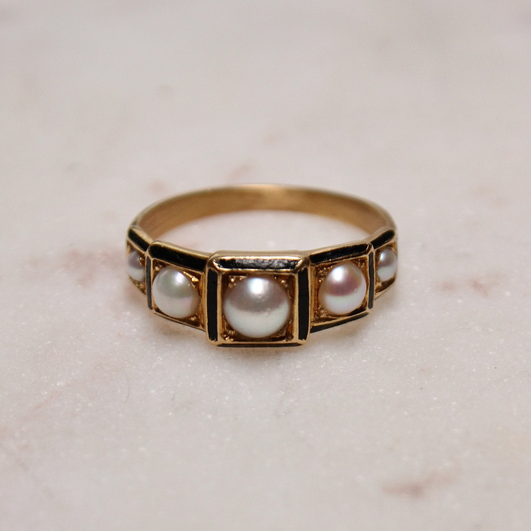 This antique mourning ring, circa 1880s era is a true treasure. Crafted from 18k gold, this piece is adorned with five lustrous graduated white sea pearls, individually set in square bezels, and framed with black enamel, offering a striking contrast that embodies the classic mourning style of the period.