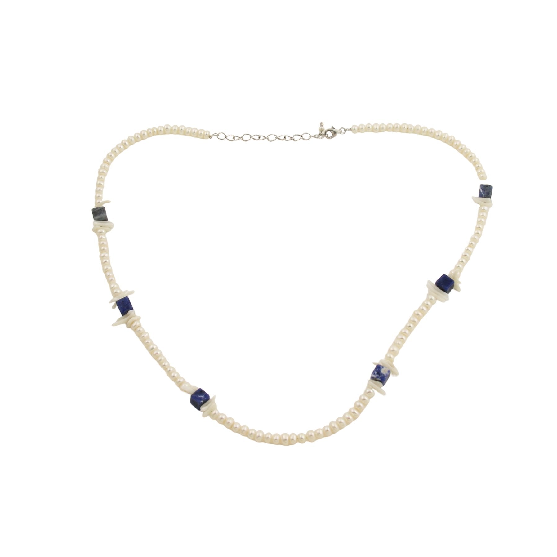 Overall, this lapis and pearl beaded necklace can be a timeless and beautiful addition to any jewelry collection, and can be worn for a variety of occasions, from formal events to everyday wear layered or a stand alone piece.