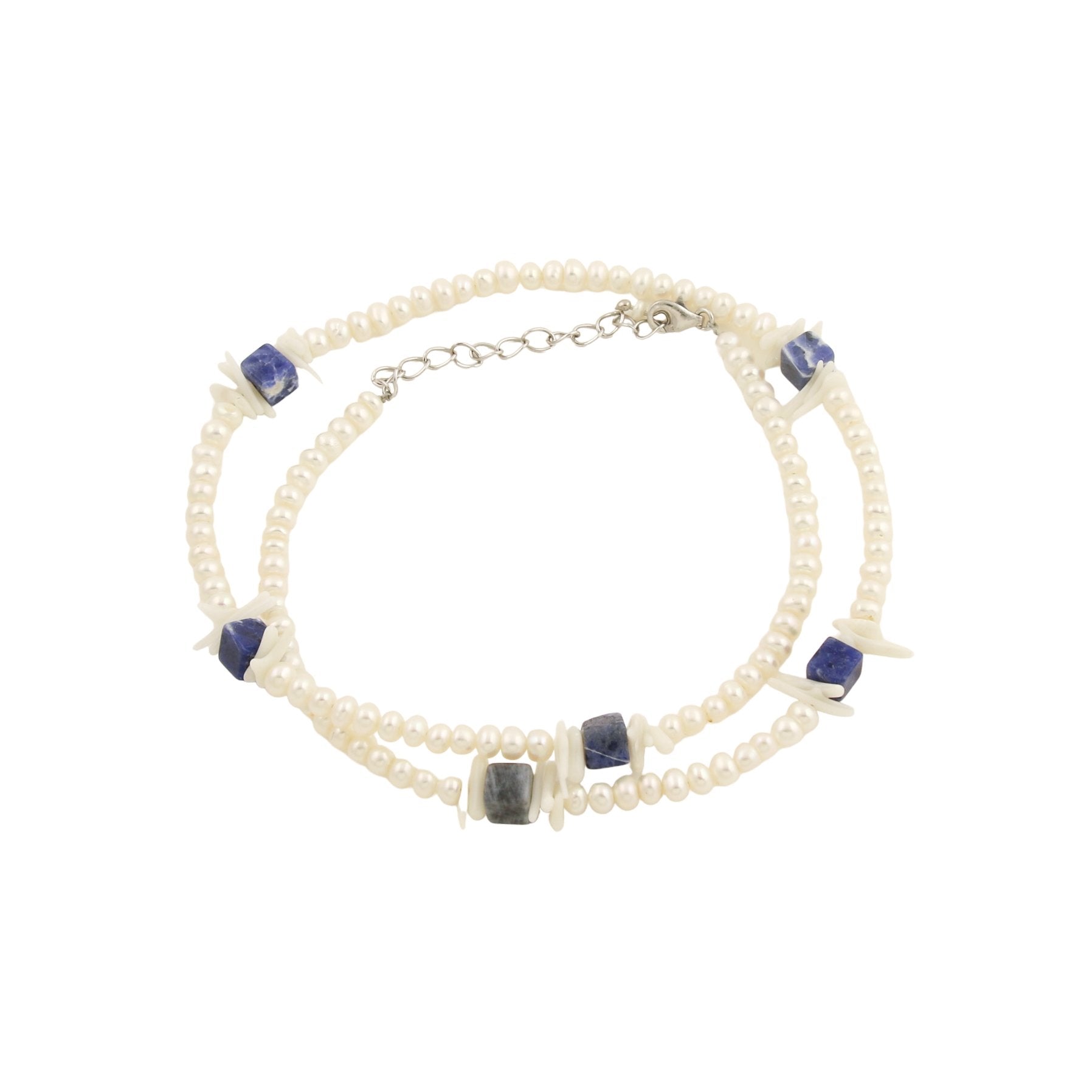 Made with white 4mm pearls and Square Lapis beads with a 2inch adjuster and sterling silver lobster closure.