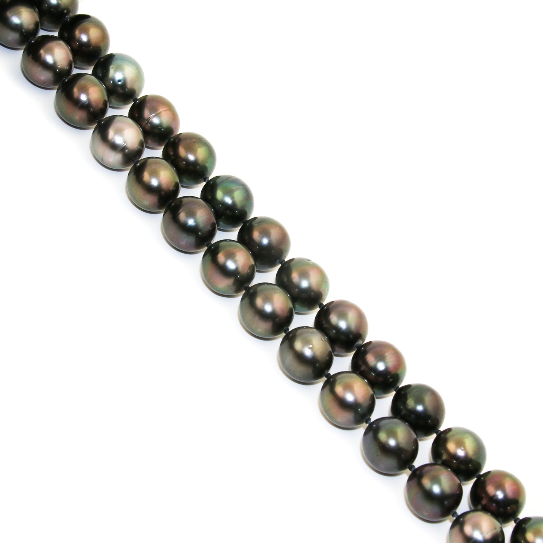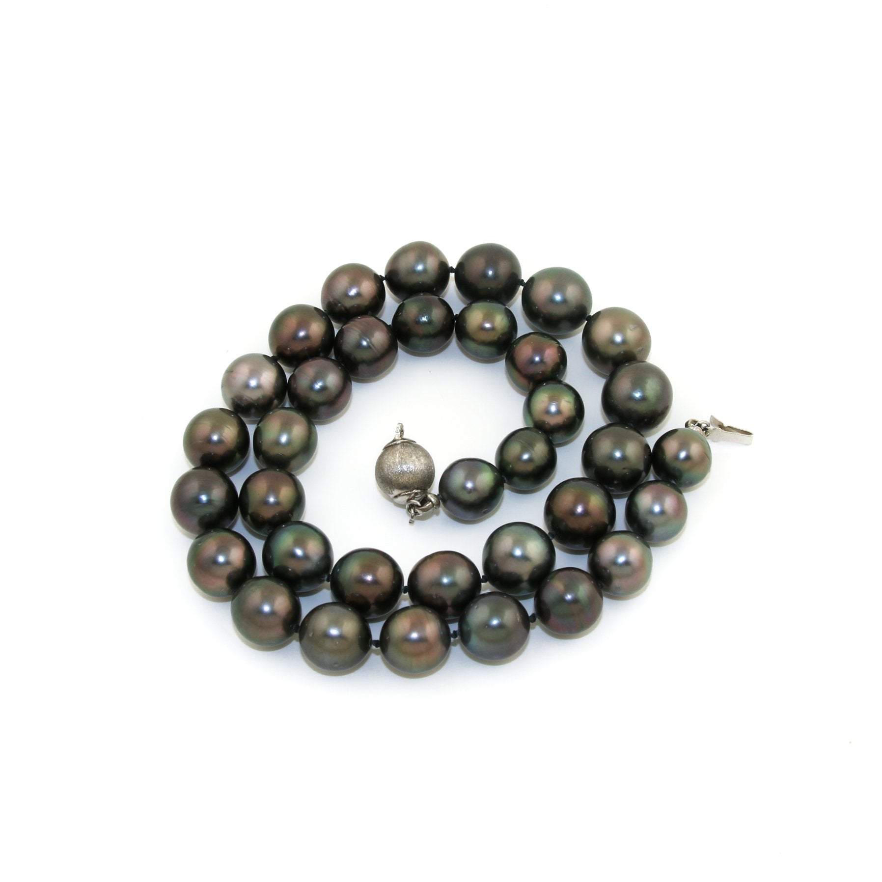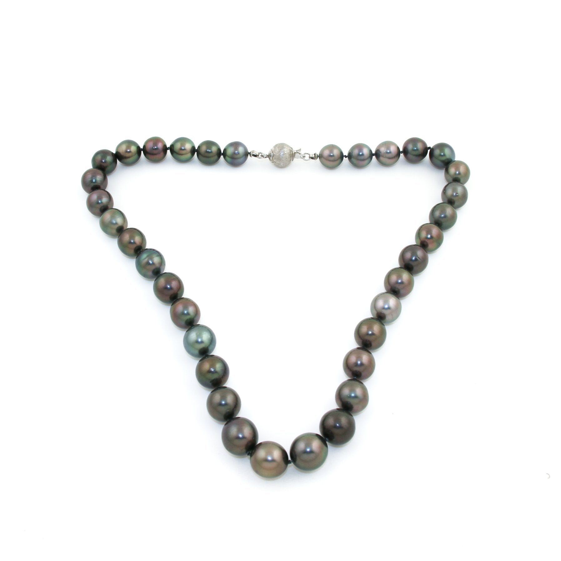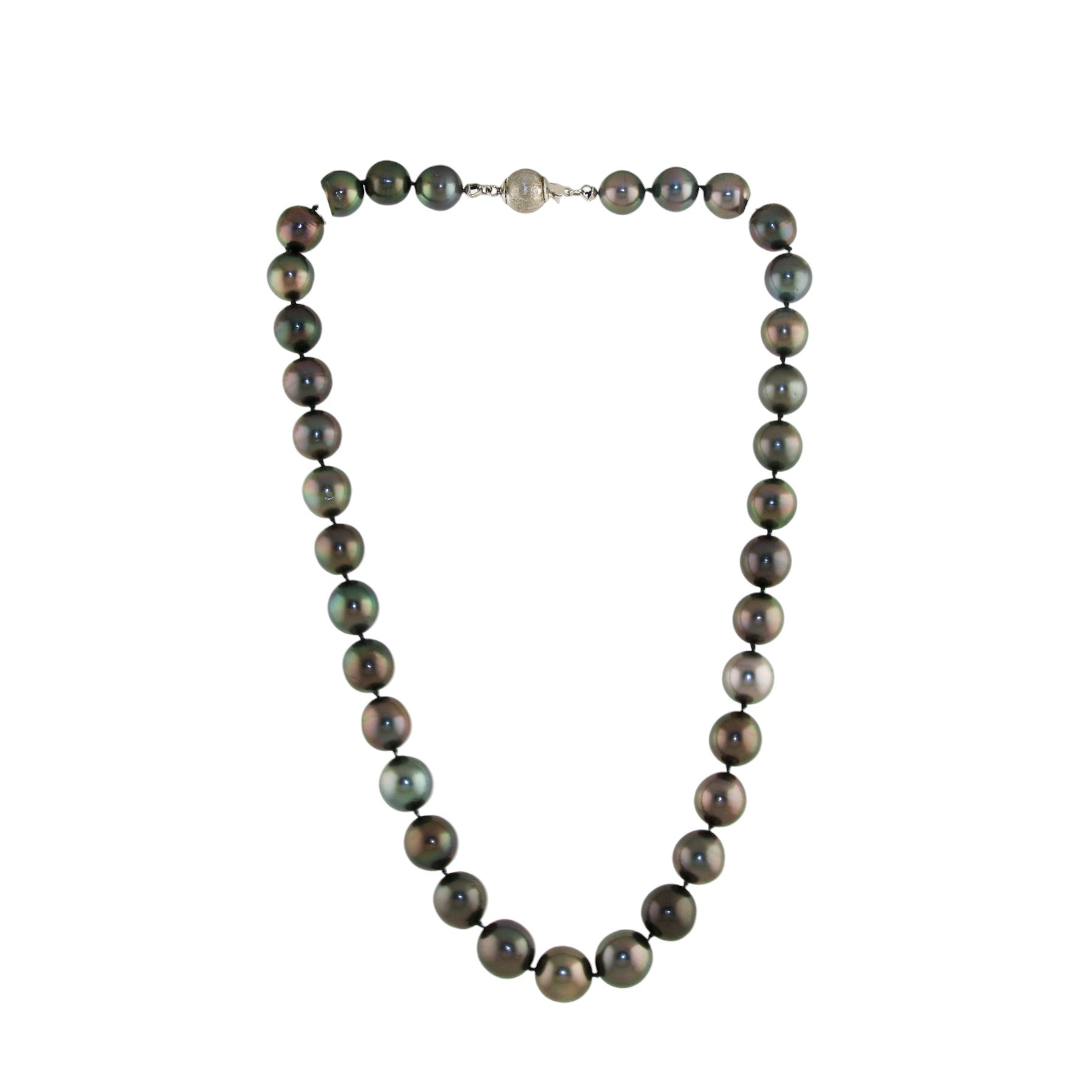 This exquisite necklace features luxurious, natural Tahitian black pearls with a rich, dark luster. Each pearl is approximately 10mm in diameter, showcasing the unique iridescence that Tahitian pearls are renowned for, reflecting a spectrum of colors from greens and blues to bronzes and grays. The necklace is finished with a brushed silver closure, providing both security and a sophisticated touch to this timeless, elegant piece.