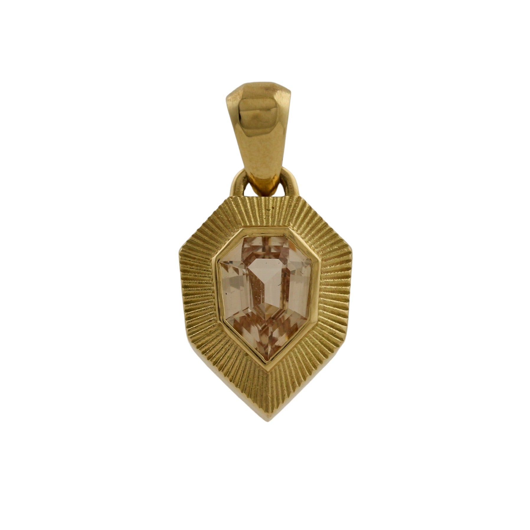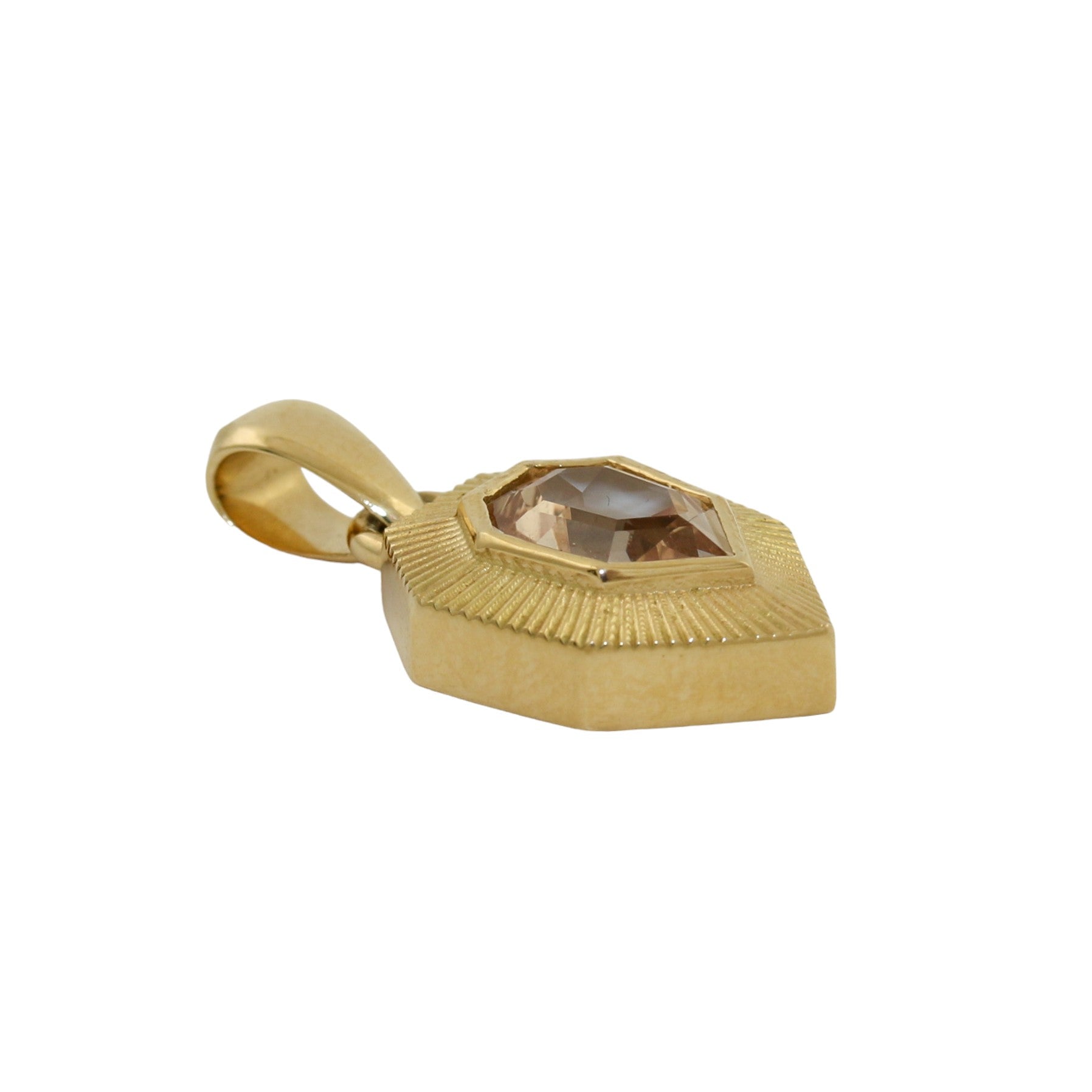 A brilliant art deco-inspired pendant showcases an 18k gold bezel intricately etched to resemble a sunburst. The center stone, a peach padparadscha radiates a warm, captivating hue that beautifully contrasts with the richness of the yellow gold setting.