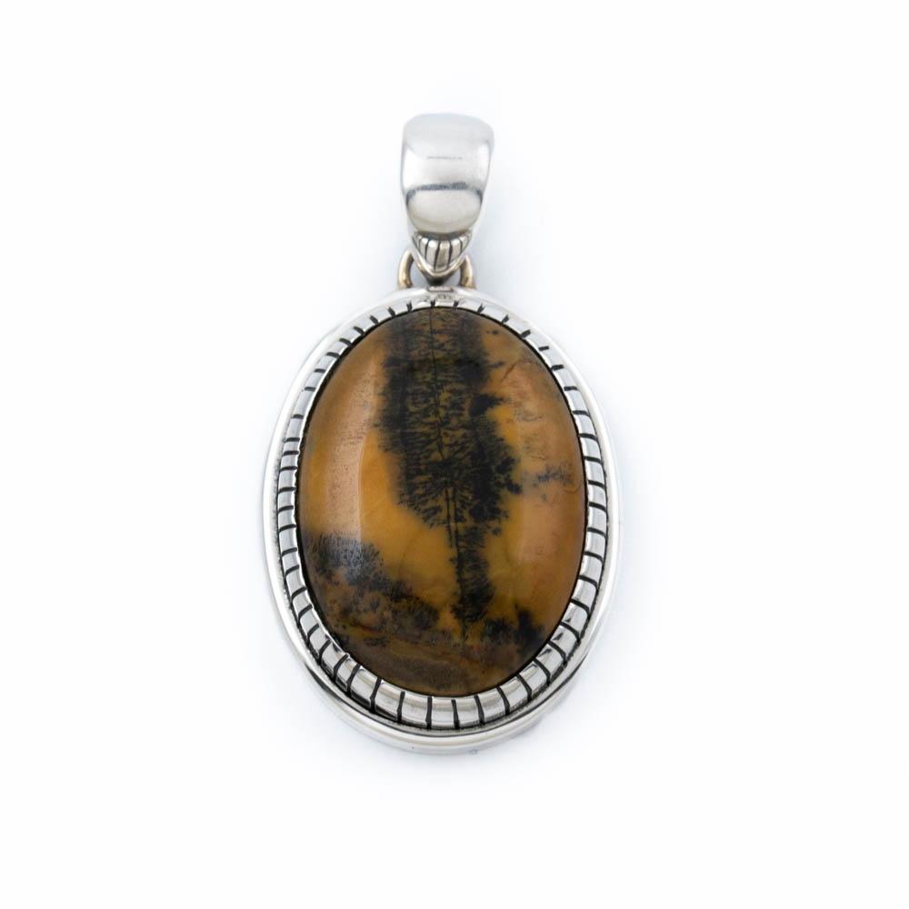 Beautiful mustard yellow jasper pendant that is hugged by a sterling silver hand-cut bezel. With various warm tones, this would make a lovely piece to add to anyone's collection.