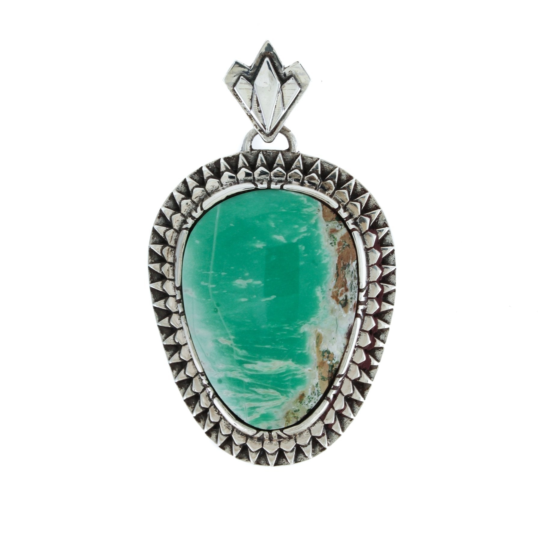 A truly ethereal Variscite pendant, hand carved and hand cut sterling bezel with a unique look.
