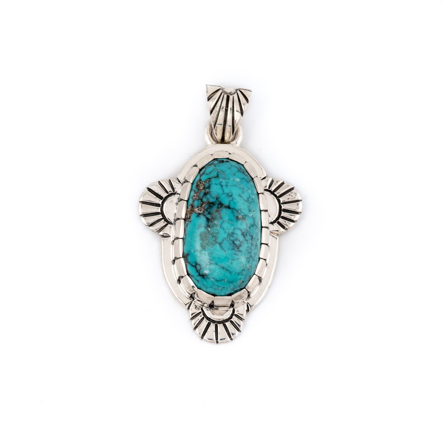 An absolutely beautiful, pendant made by our shop. This piece features a Hubei turquoise stone set into a sleek hand-cut sterling silver bezel and finished with ornate detail. A embellished design that is a great everyday piece.