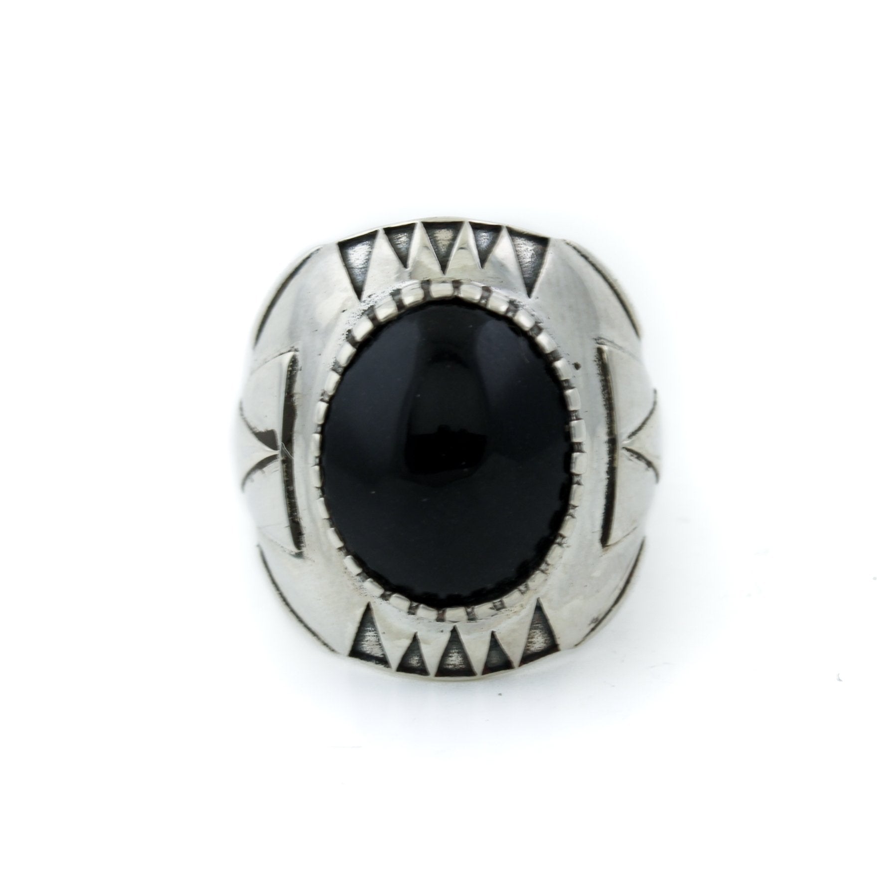 This contemporary Art Deco influenced geometric ring by Kingdom is truly something special! A black Jade  stone which is surrounded by a sterling silver hand cut bezel is unique and striking. A statement ring that would look killer paired with any of your other favorite gems or works perfectly as a stand-alone piece!