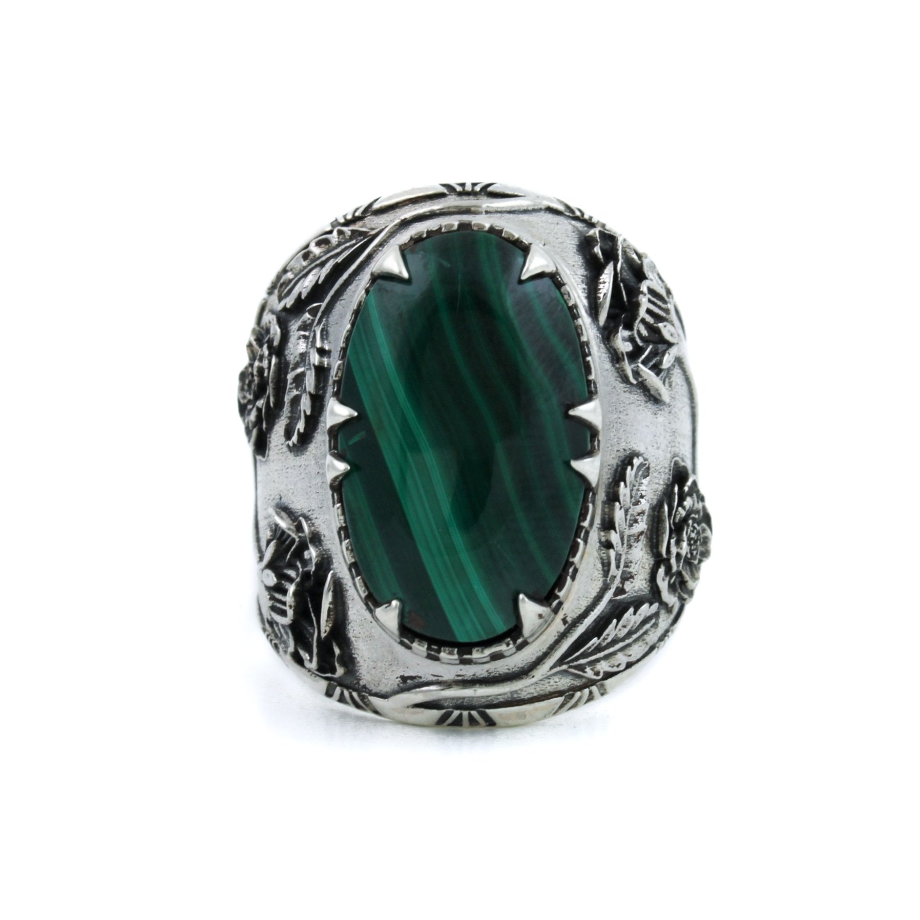 This stunning ring is a product of Kingdom. The beautiful silver work features a unique floral design on the band and houses a gorgeous piece of malachite. The stone is set in sterling silver, with our very own design. A perfect ring for someone looking to add a little colour to a collection of silver jewelry, but would also look amazing on its own.