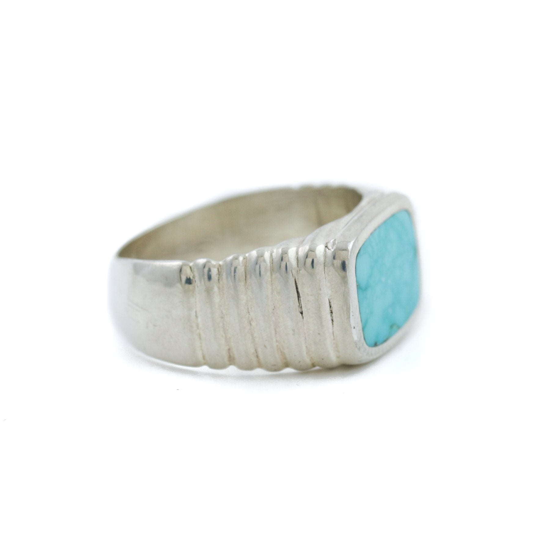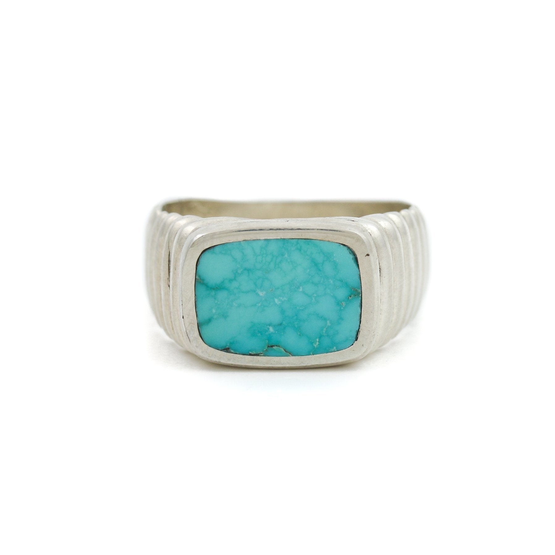 Introducing our handmade silver inlay ring, a stunning piece of jewelry that's perfect for any occasion. The centrepiece of this ring is a mesmerizing Hubei Turquoise stone, which catches the light and glimmers with a Caribbean ocean blue hue. The stone is surrounded by a sleek and simple silver design, making it a truly unique piece that is both elegant and understated.